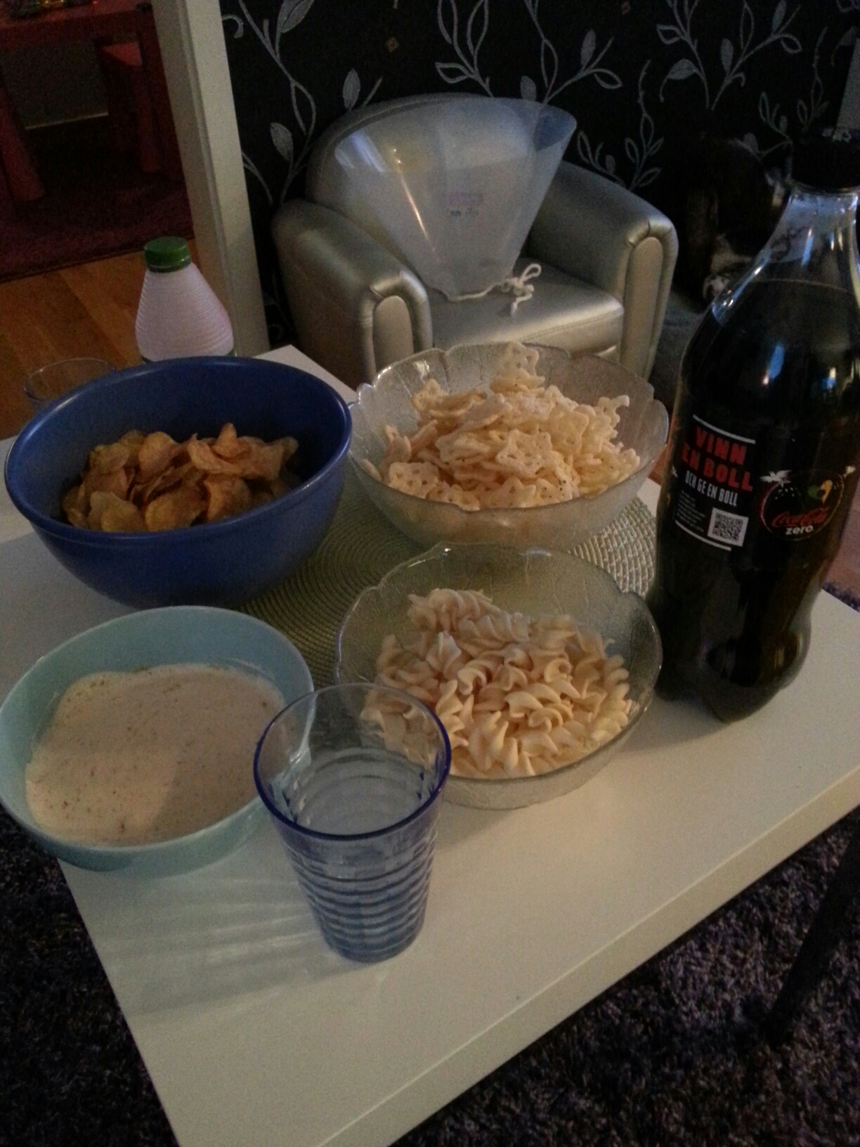 Skruvarna och stjärnorna är ”light” och läsken, bara chipsen och dippen som är fettbomber. Men jag smakade lite bara. Gott!!
