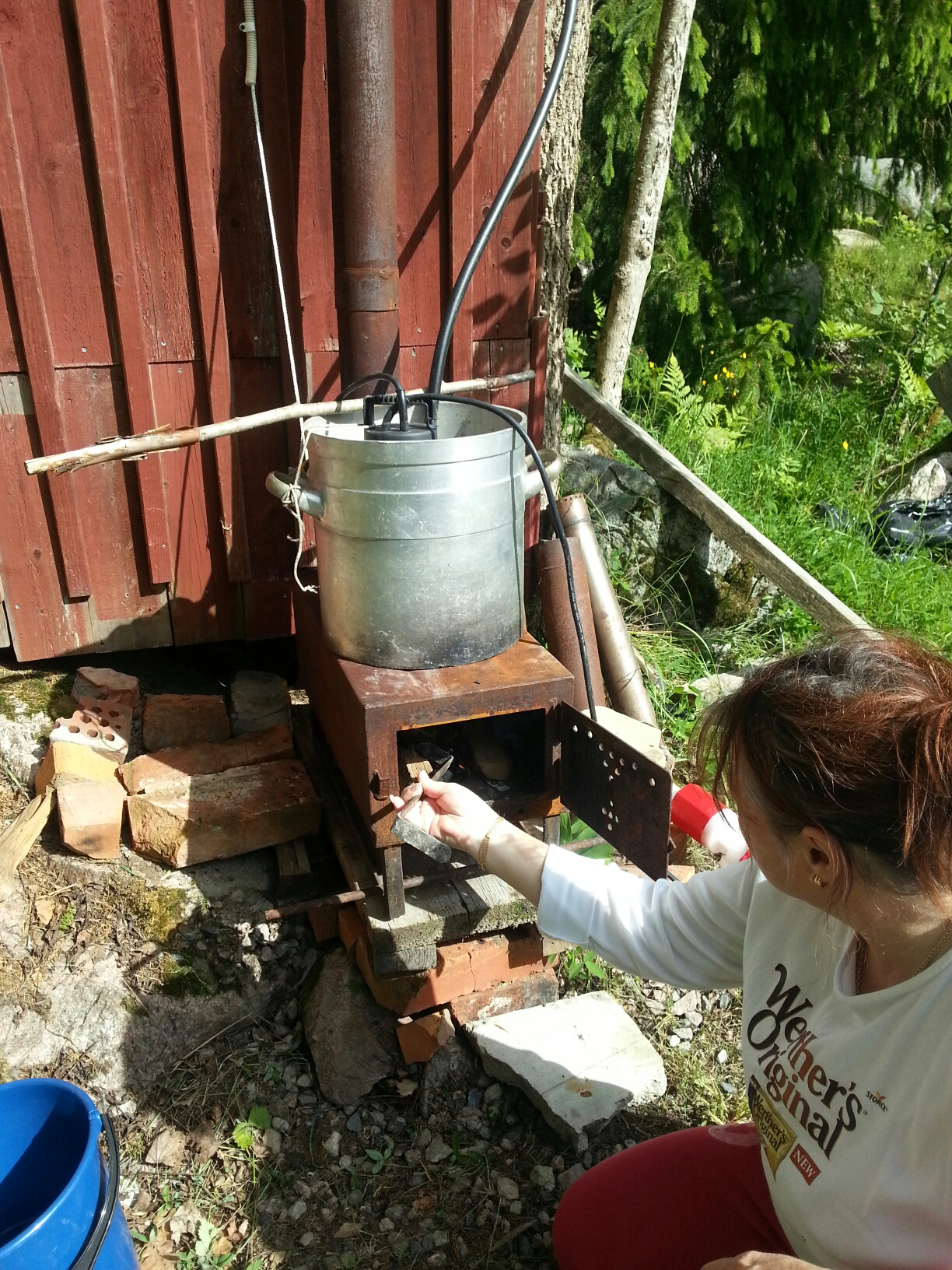 Man eldar i en kamin där det står en stor kastrull med en pump i. När vattnet är lagom varmt går man in i duschen (utan tak, men med väggar), drar i ett snöre som slår på strömmen till pumpen och sim salabim så kommer vatten i duschslangen!! Sonen är rena uppfinnar-Jocke! Innan värmde vi vatten inne och hällde i vattenkannan och hjälptes åt att duscha varandra.