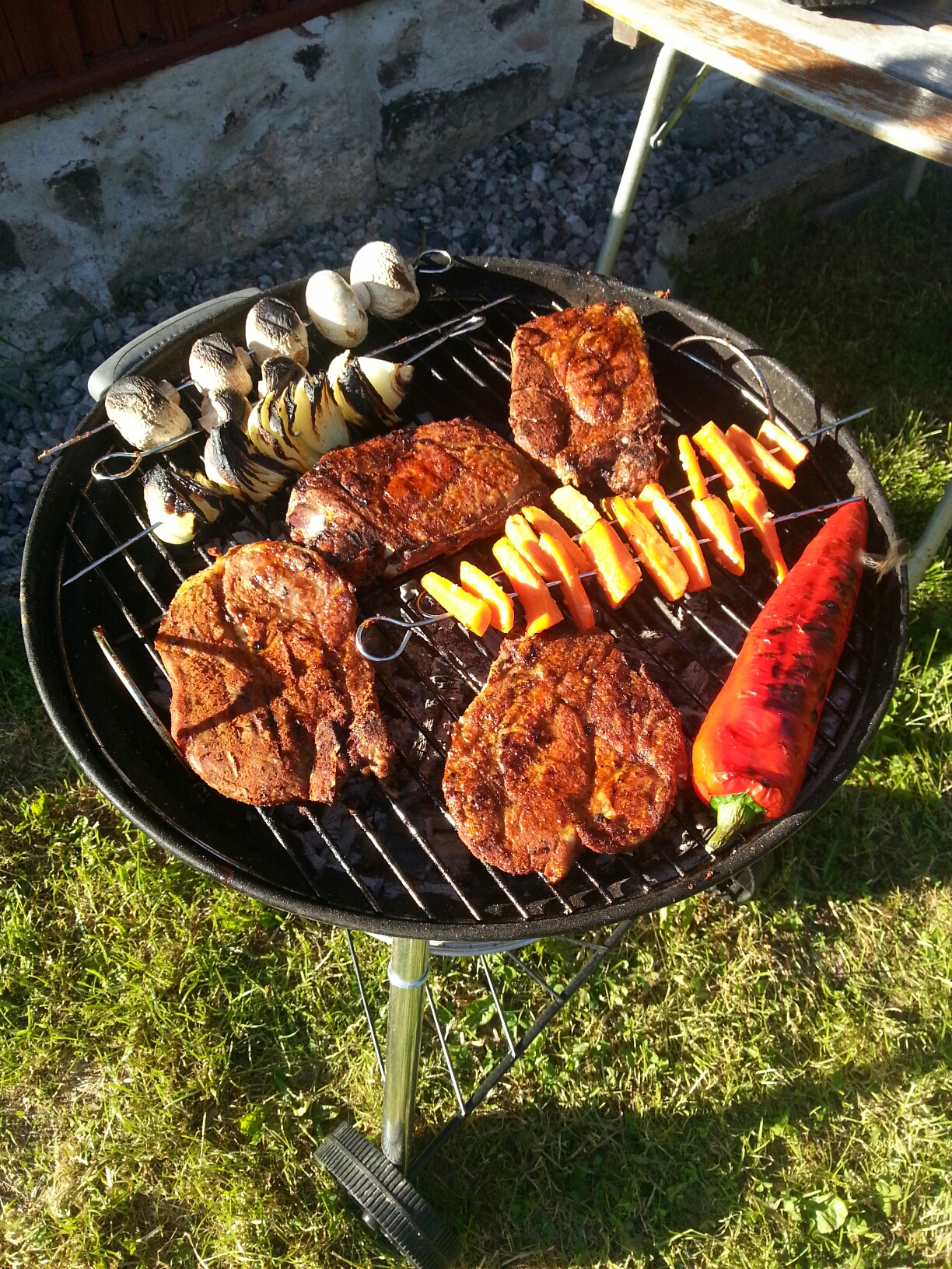 Vi grillade kött, grönsaker och la klyftpotatis i folie. Till det åt vi en kall sås på kvarg, fil, lite majonnäs och kryddor. Supersmarrigt!