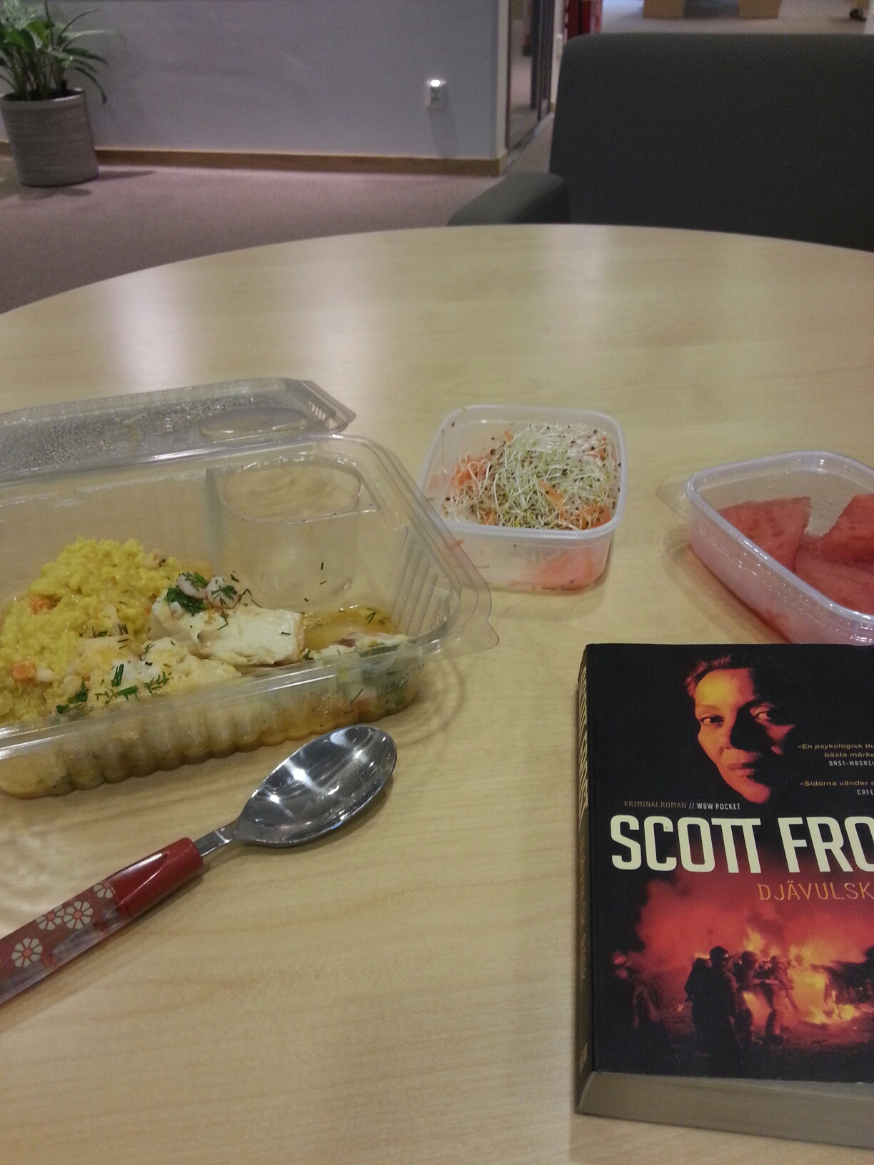 Jag spar ju halva portionen från lunchen och idag åt jag resten innan jag gick från jobbet. Jag satte mig i vårt fikarum och åt. I lådorna där finns bestick. Men inte alla sorter….