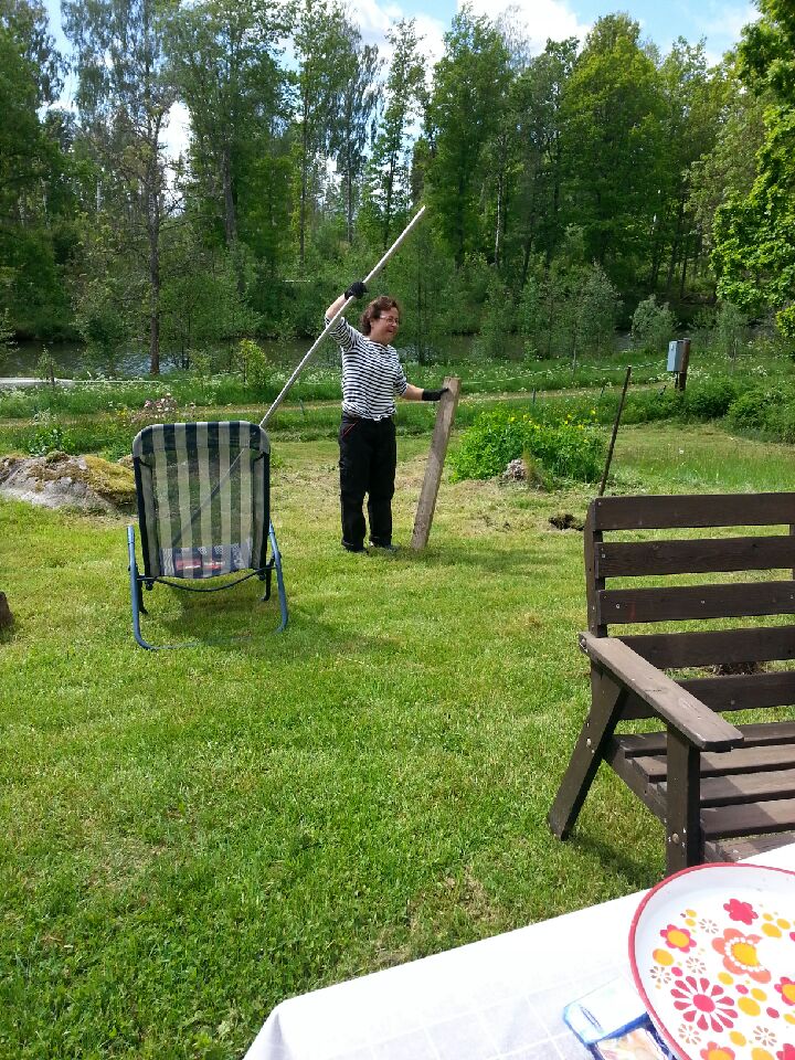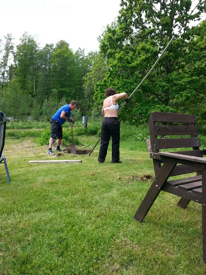 Jag blev lite varm av att få upp stenbumlingar ur marken, så tröjan åkte av efter ett tag. Men jobbarbrallorna är på!