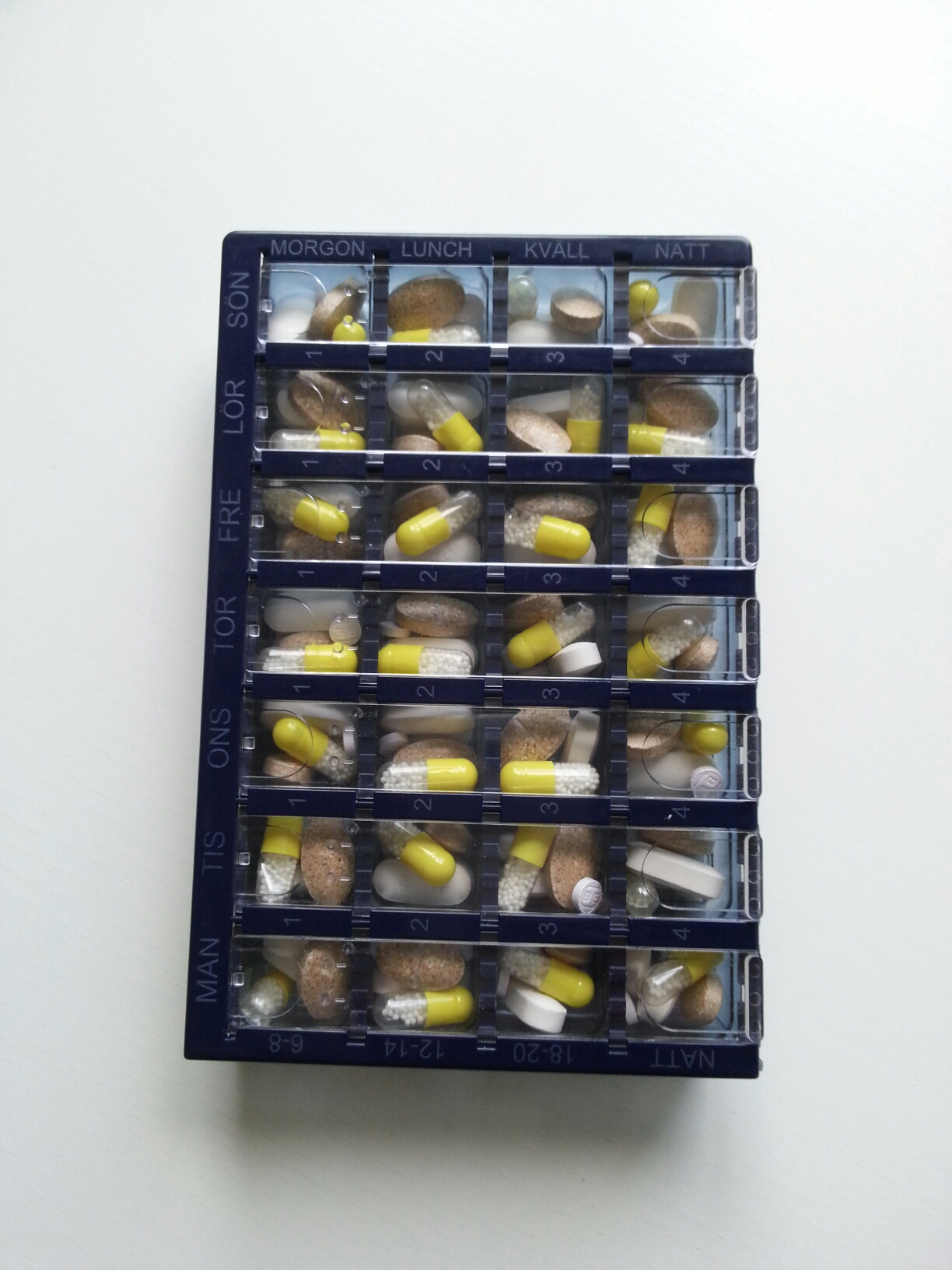 Jag tar ju mina vitaminer och antidepp på morgonen. Och till natten ska jag ta den mot höga blodfetter. Så jag har lagt dem i respektive fack i dosetten, och alltså gjort om proceduren varje vecka.