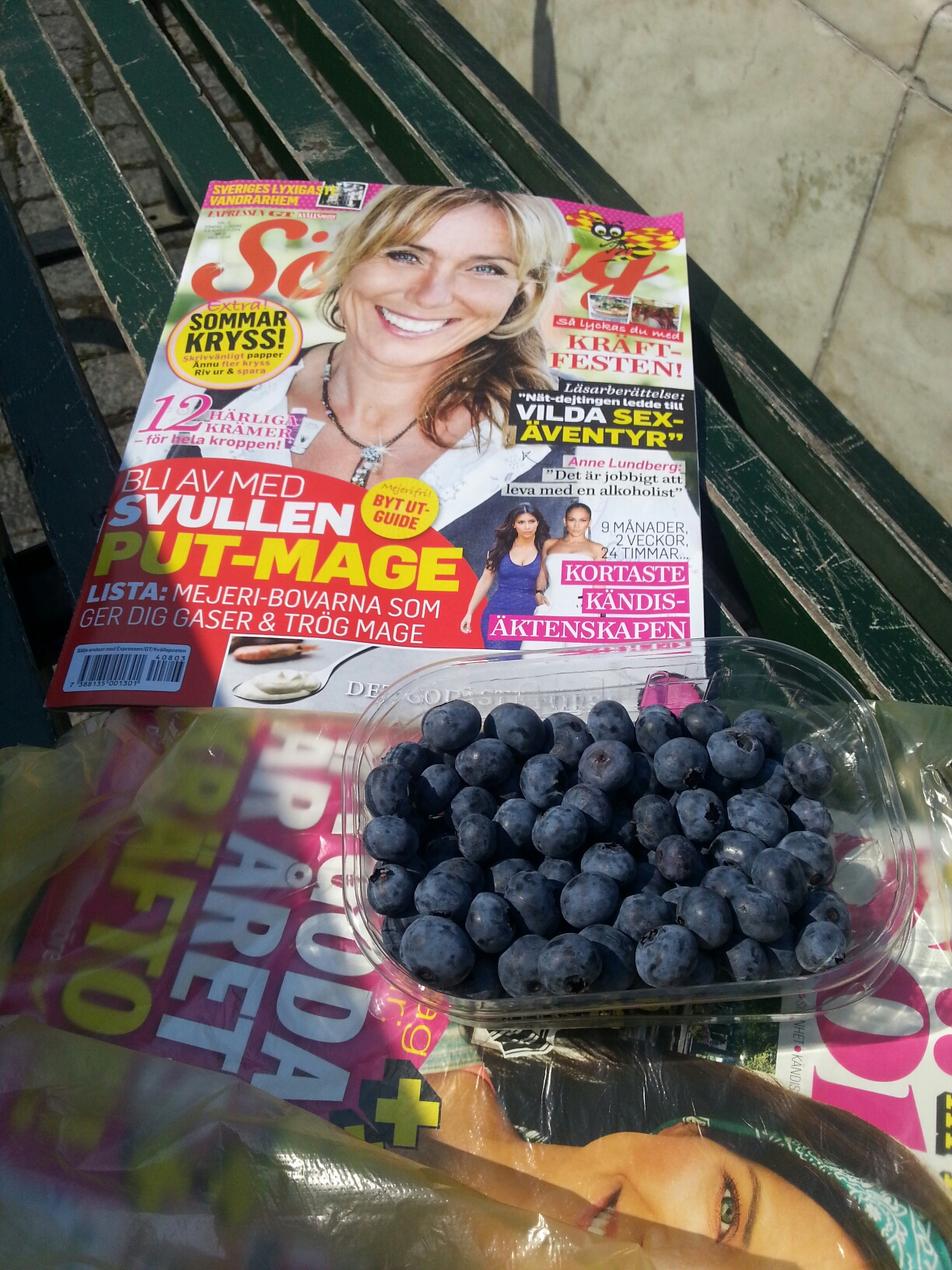 När jag åkte hem stannade jag i centrum och handlade. Nettis messade att hon och Bäbis var på väg, så jag satte mig i solen med blåbär och söndagsbilagan.