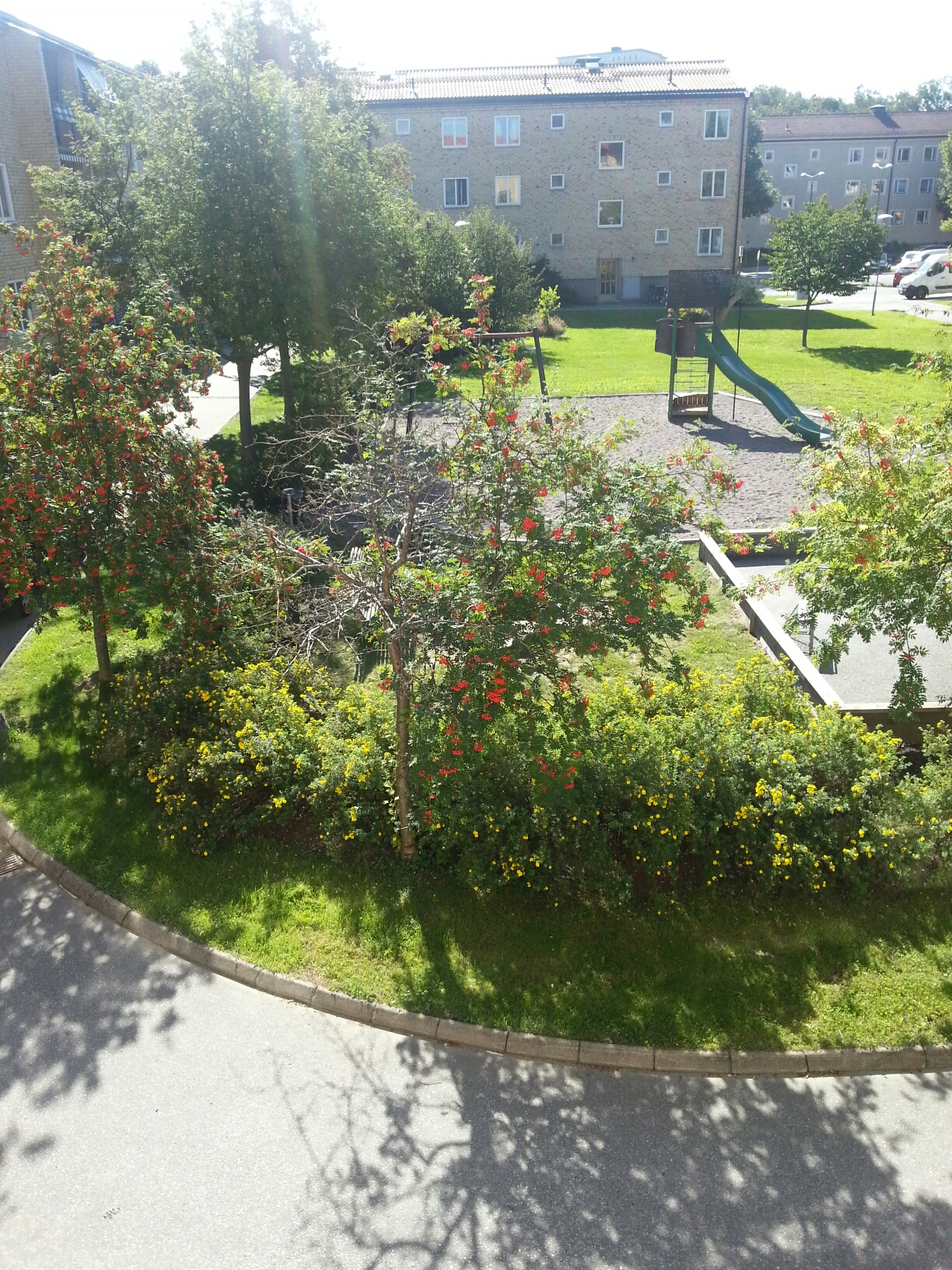 Utanför står några rönnar, och jag har retat mig på att värden inte sågat bort en massa döda grenar på ett av träden.