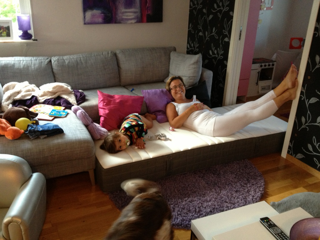 Nettis har bytt sina madrasser så vi tog en av de gamla och la framför soffan. Bäbis och jag tyckte det var perfekt att slappa där!