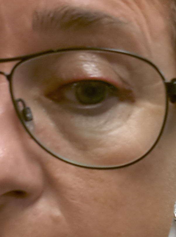 Nu har blödningen liksom runnit ner lite mer vid yttre ögonvrån.
