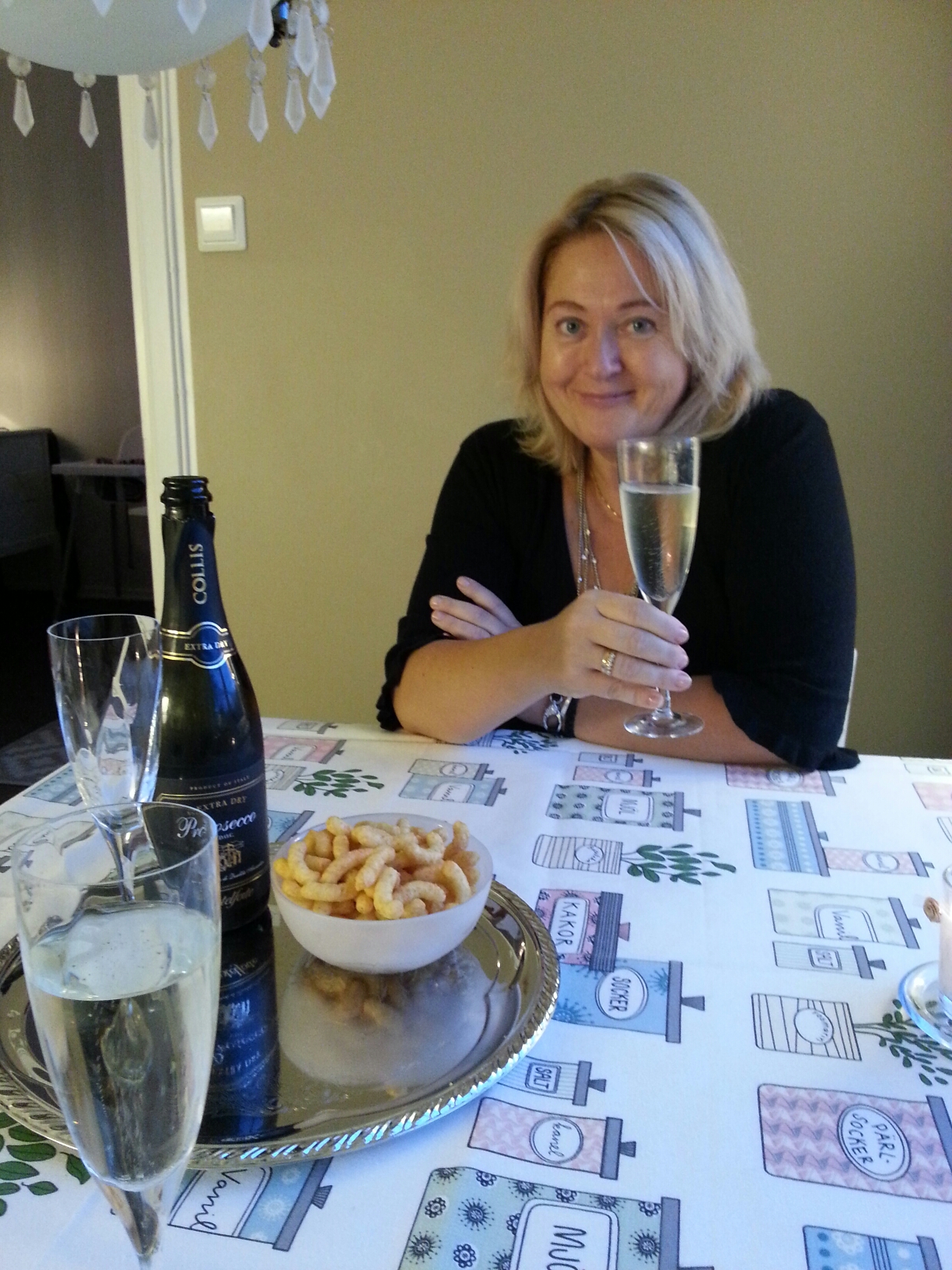 Vi tjuvstartade med bubblet och jordnötsbågar. Men ganska snart kom även fru Universum så då fick hon oxå lite bubbel.