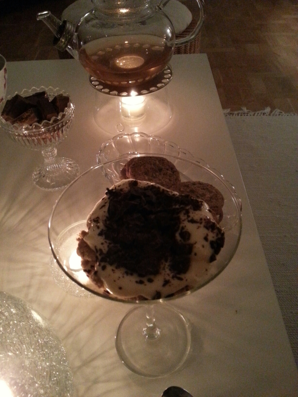 Menyn var anpassad för att passa oss som alla gjort en Gastric Bypass, så efterrätten var vaniljkvarg varvat med krossade, osockrade, digestivkex och toppat med lite krossad mörk choklad. Mona, som är den av oss som är mest känslig för socker, kände av att det var socker i chokladen. F’låt!