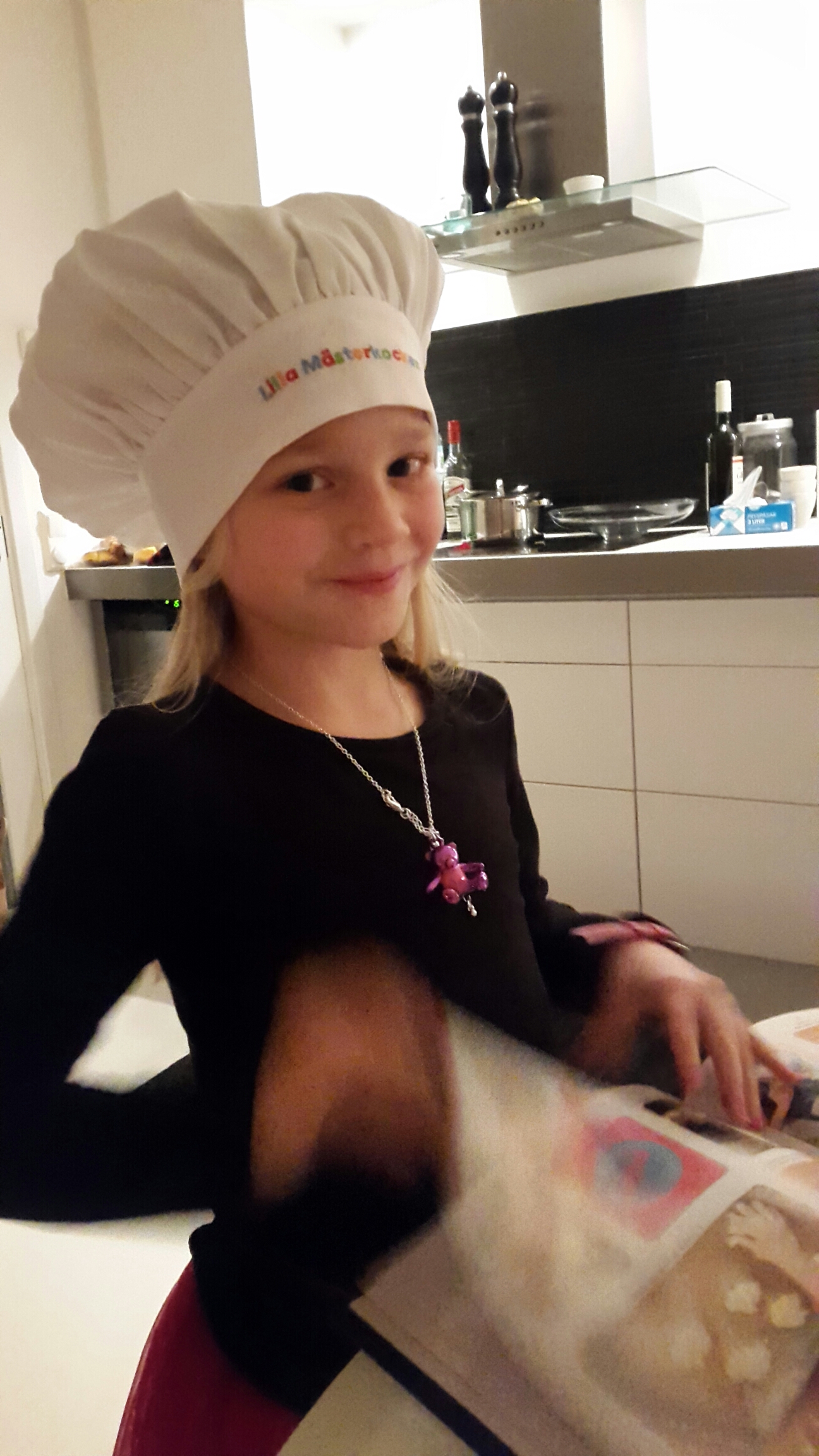 Pudding fick en egen kokbok av mormor och morfar. Dagens meny är redan planerad, helst ville hon börja baka på en gång!