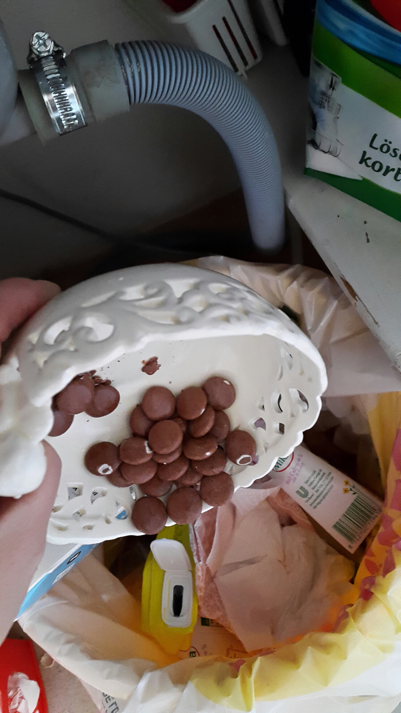 När jag skulle röja så hittade jag skålen med Never stop. Åt några stycken (färre än igår…) och nästan på en gång började jag svettas och må tokilla!  Så sängläge 1 timme.