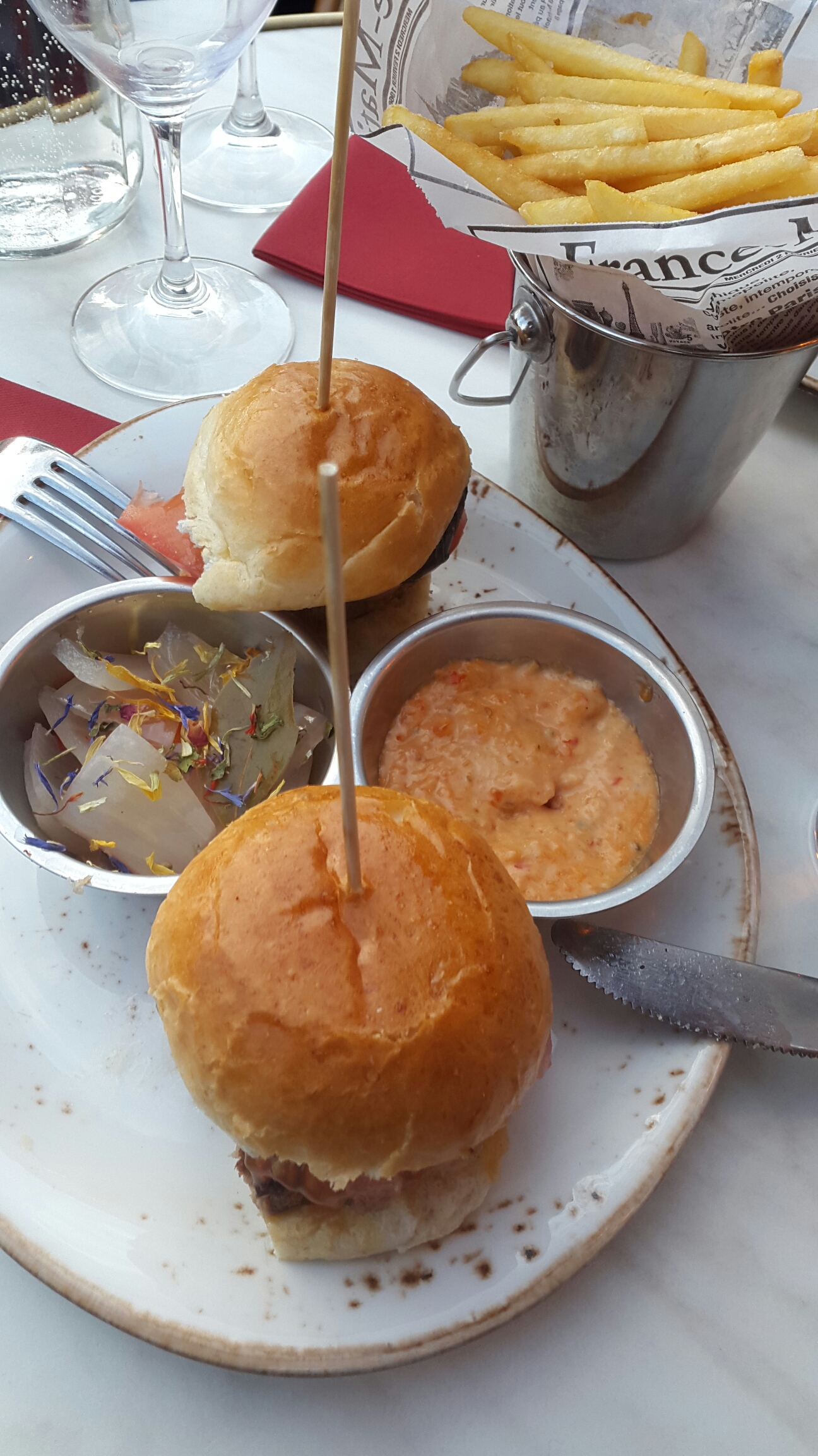 Jag och en hel del andra var i Kungsträdgården efter jobbet idag. image image Så otroligt mycket blommor, man tappar nästan andan, så vackert är det! image Jag satt en stund på en bänk, njöt av alla blommor, tittade på folk och läste min bok. Sen kom Katta och vi gick till en av restaurangerna och tog ett glas rosévin. image Gott och mysigt!  När vi suttit och babblat och druckit vin en stund fick vi bord för att äta. Tog varsin förrätt. image 2 små miniburgare, jättegoda! Jag skippade brödet dock. Vi hade Supertrevligt! Vi konstaterade att vi måste ses i stan efter jobbet oftare!