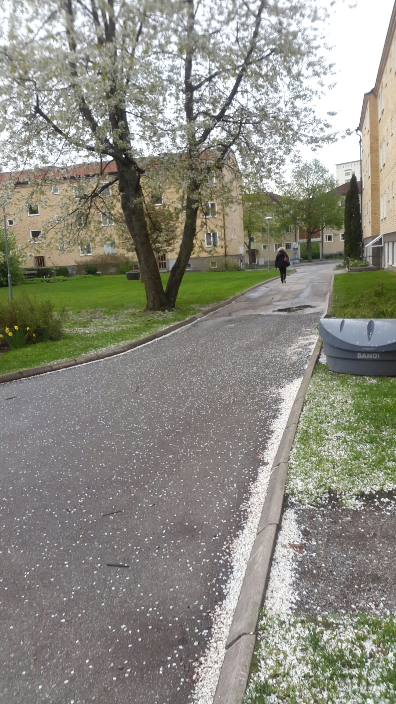 Det ser nästan ut som om det snöar på min gård. Vi har ett stort träd med massor av vita små blommor på, och nu blåser alla de små blombladen av och ligger i drivor på marken.