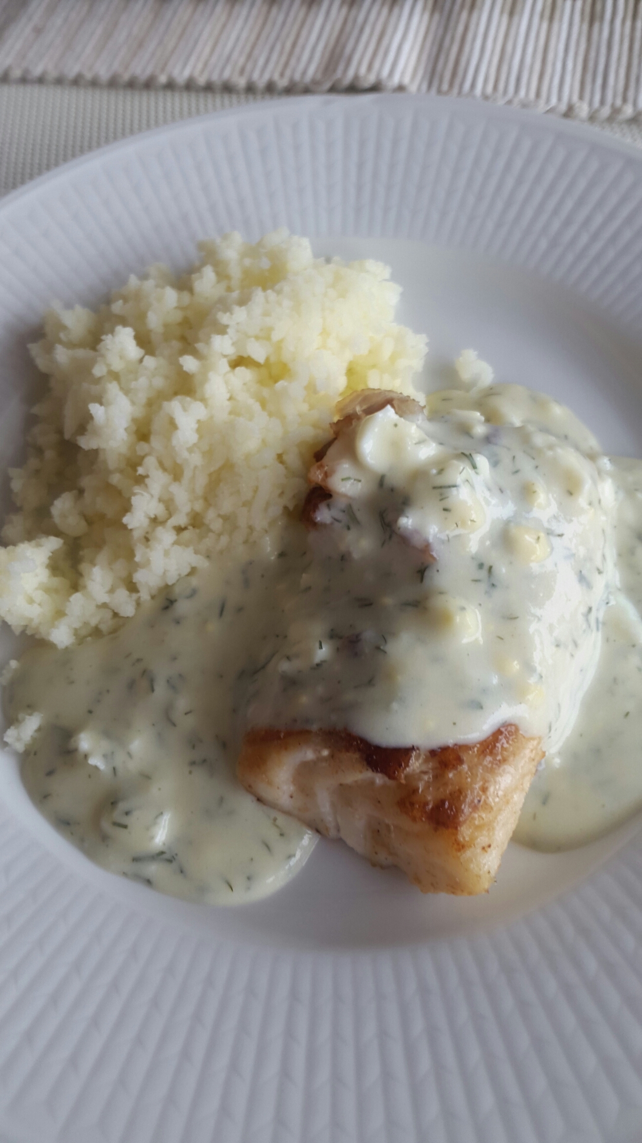 Vi babblade och åt gott, så klart! Torskrygg, pressad potatis och äggsås. Mmmmm!