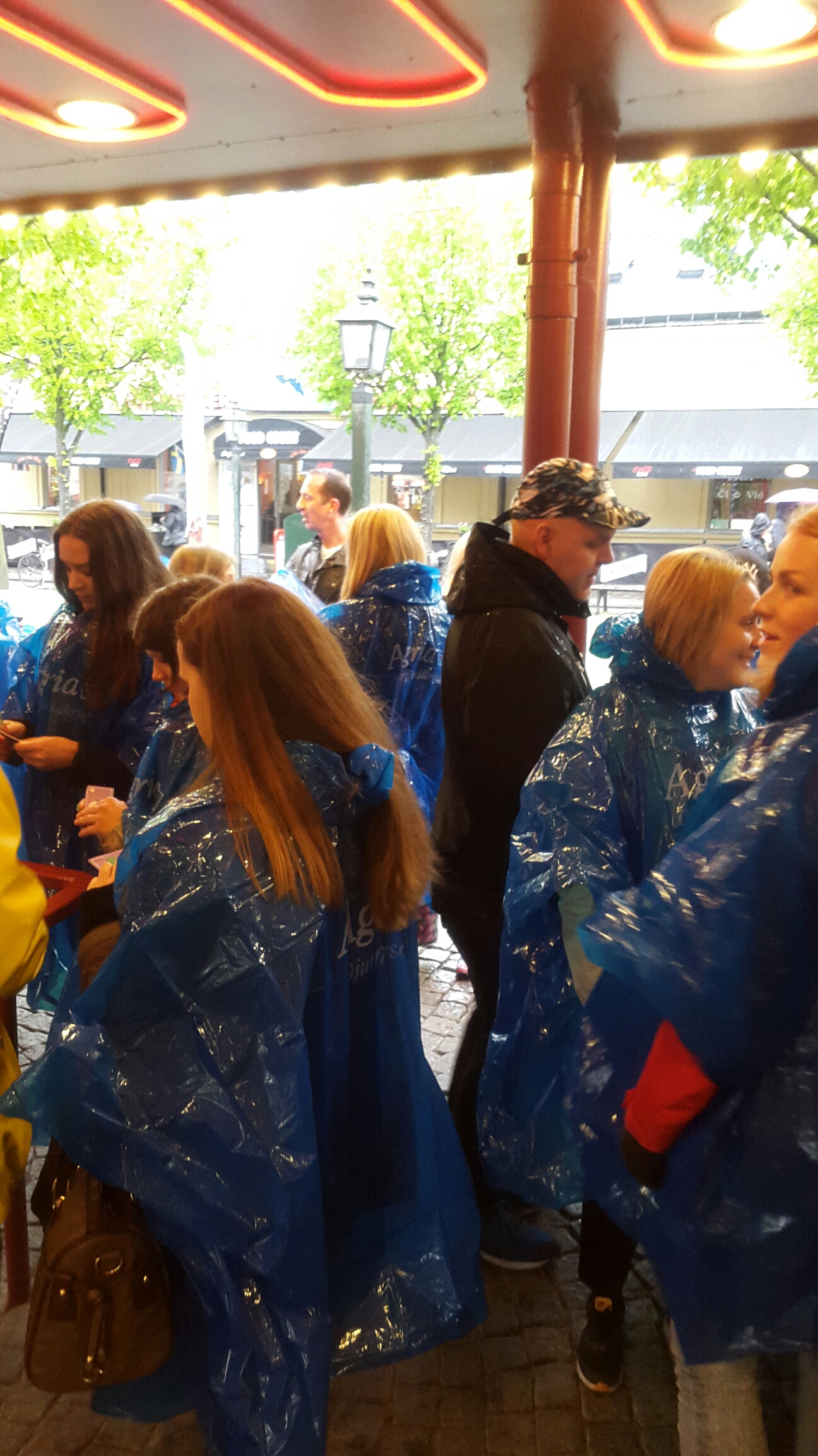 Regncaper delades ut till dem som inte hade regnkappa. Vi såg ut som en samling blåsmurfar!