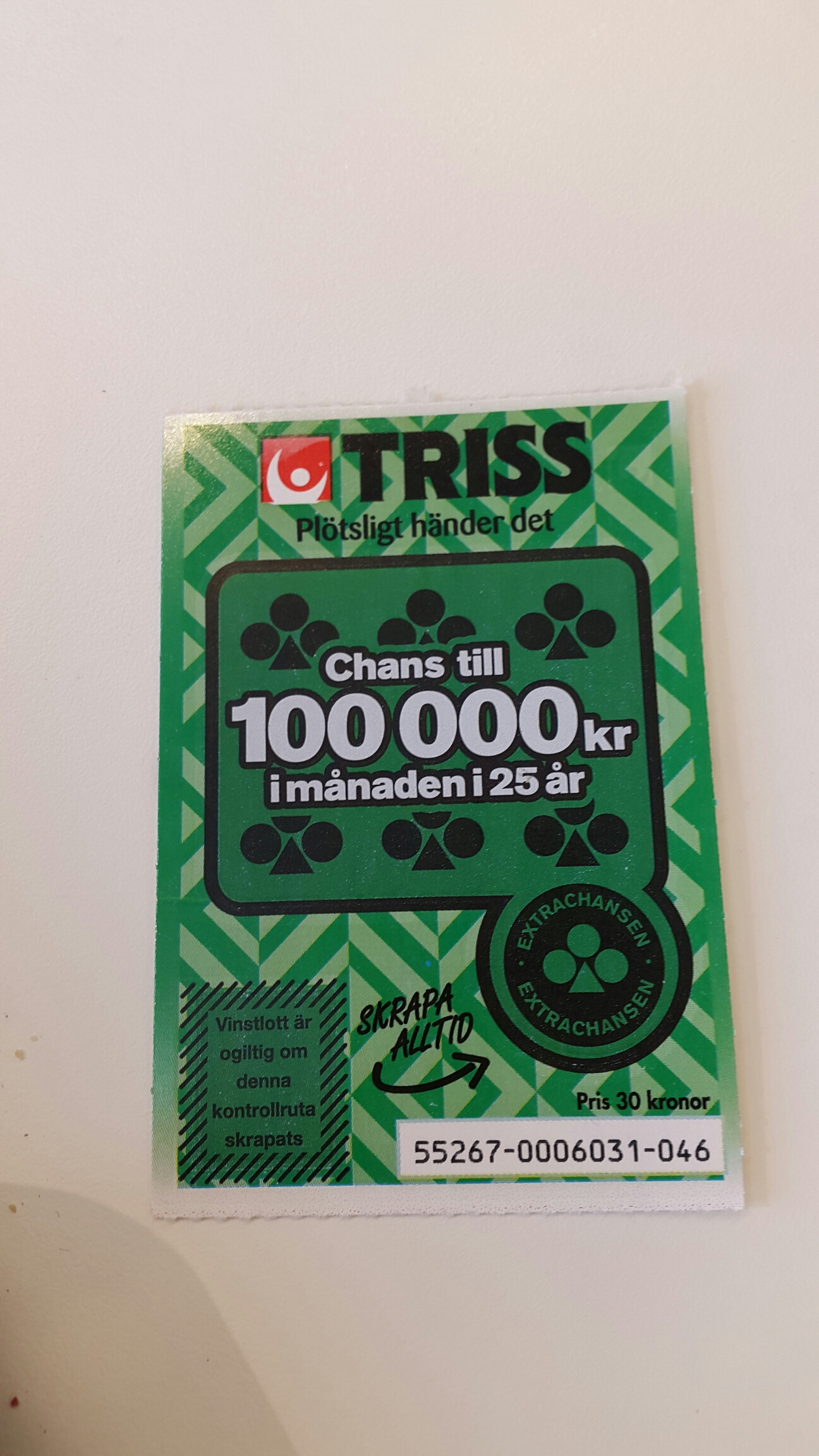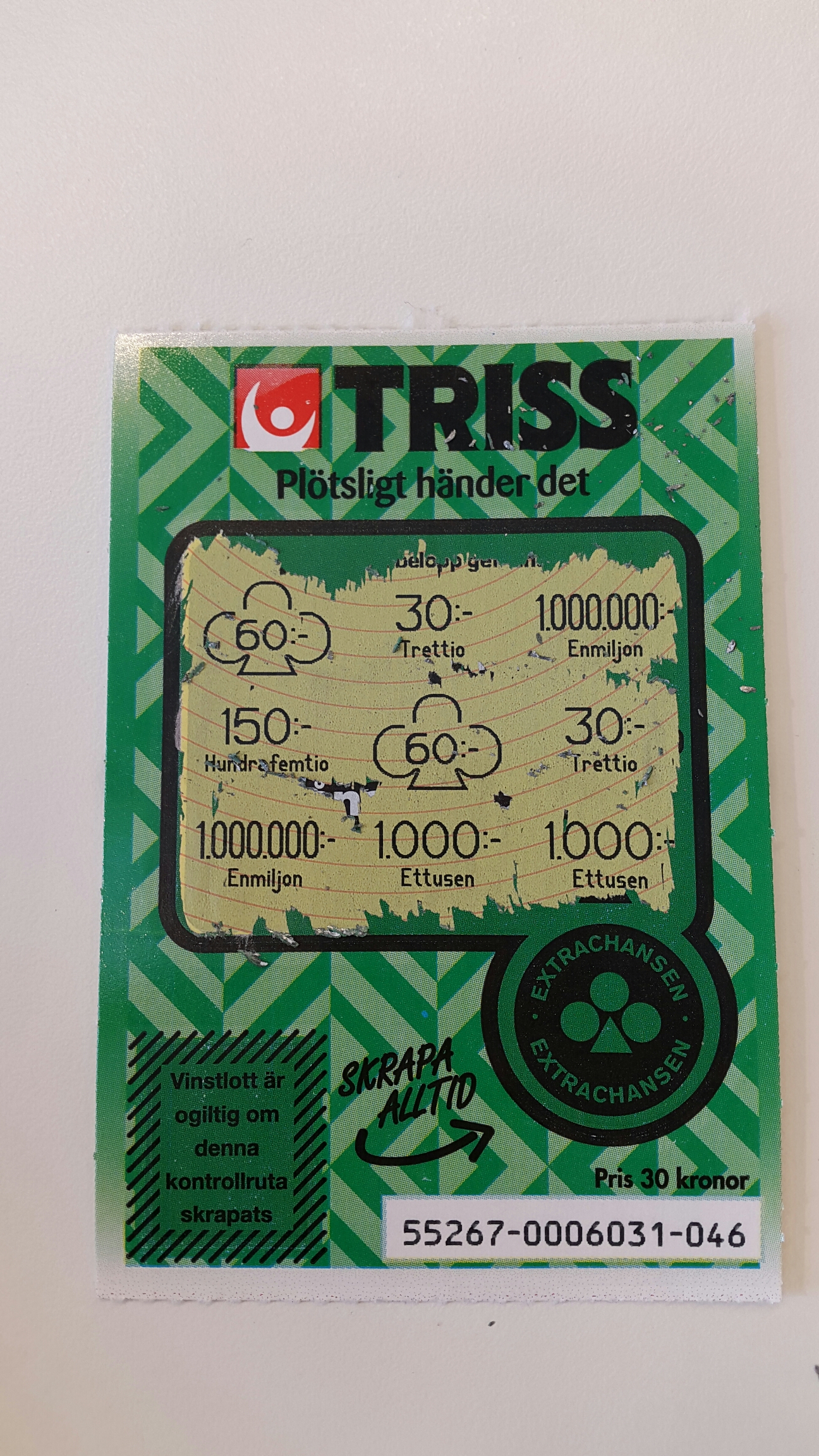 Och jag har också en triss som jag har glömt att skrapa. Undrar om man vågar skrapa den,,,,,,, Den är ju rätt fin oskrapad och innan jag har skrapat är jag ju iaf i huvudet rik 😉