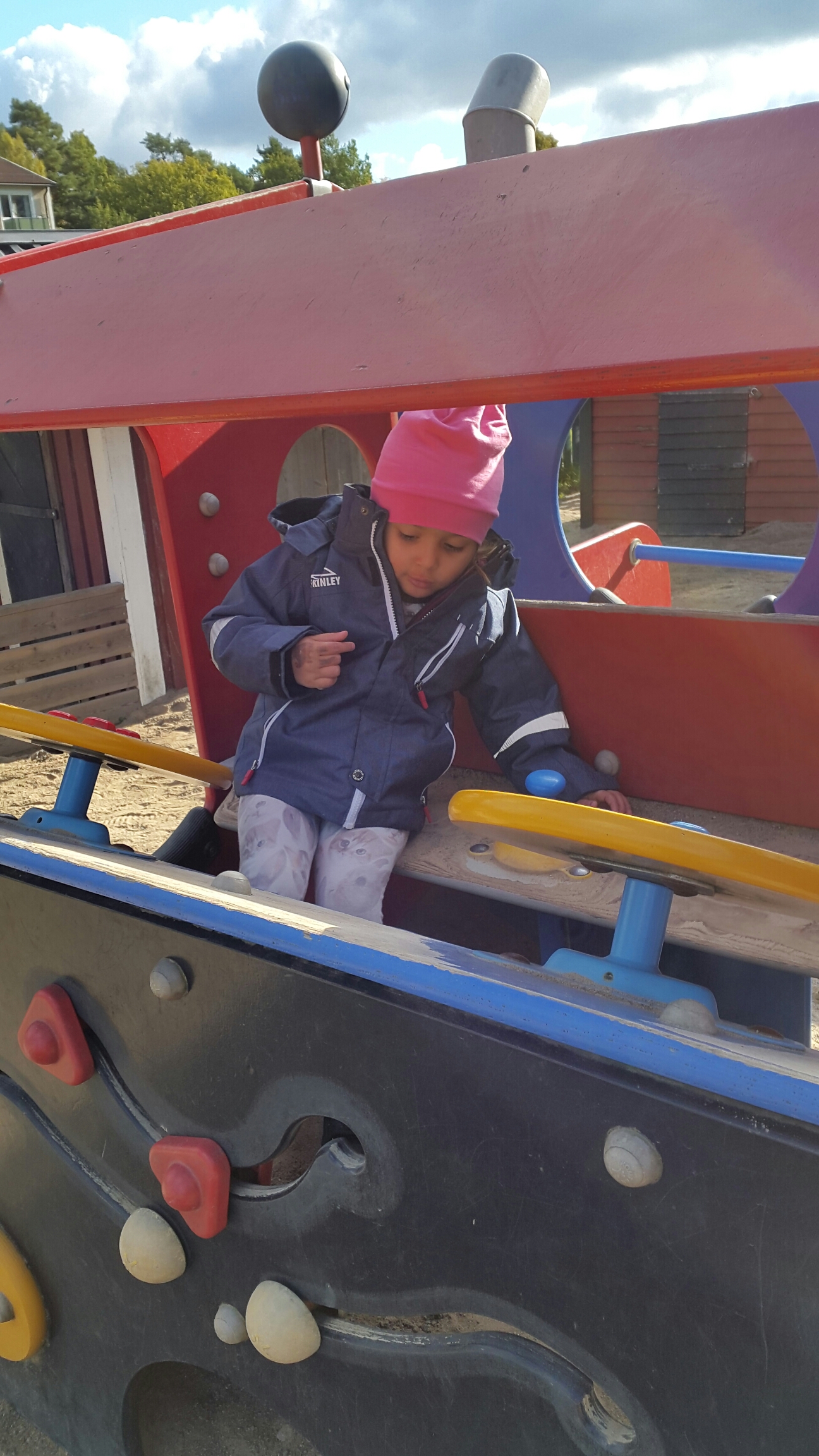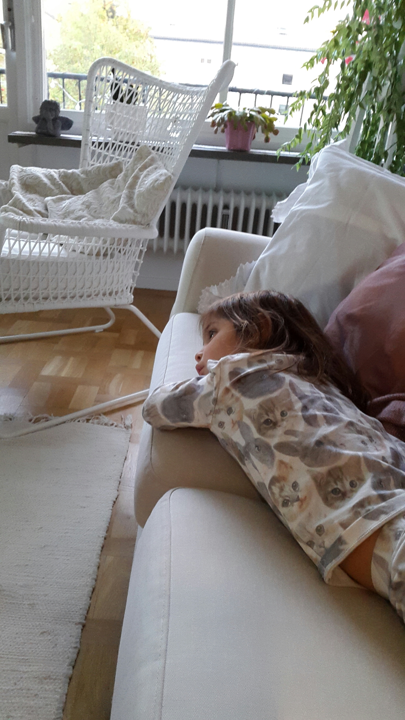 Sen gick vi upp till centrum och köpte ett par överdragsbyxor till henne. Och lekte i lekhörnan ett bra tag. Jag tog en lattekaffe medan. Sen hem och åt mellanmål och lekte lite till. Efter en stund kom hon och sa att hon vill sitta i mitt knä. – Jag orkar inte leka mer nu. Pluttan! Så vi satte på TV:n och slappade i soffan en stund.