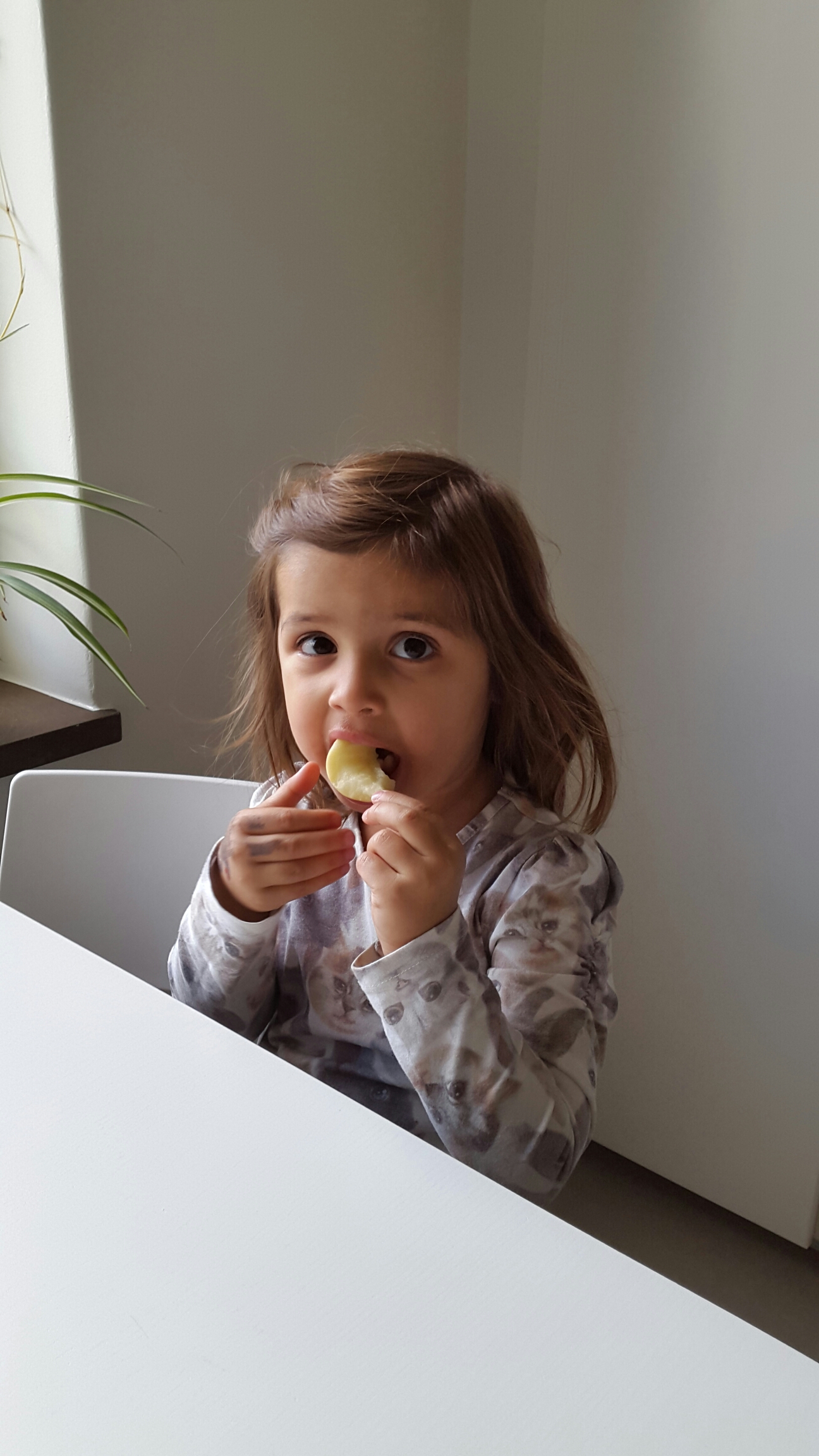 Medan jag kokade potatis och stekte fisk så åt Bäbis en hel potatis rå. -Det är gott!
