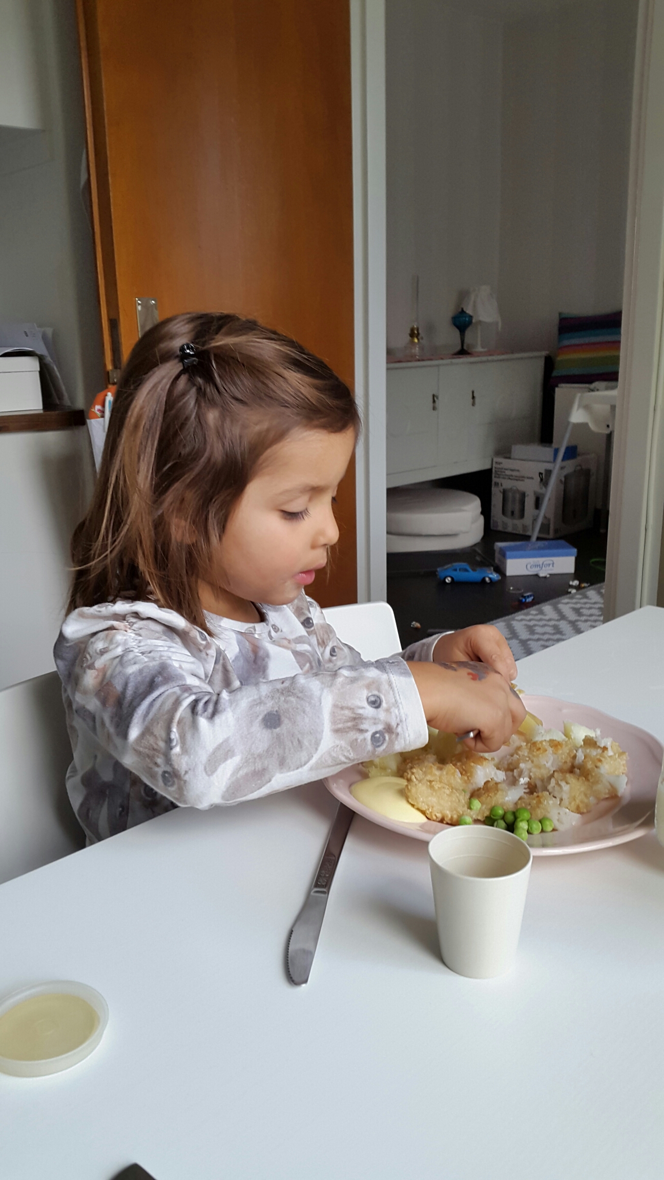 Sen åt hon 2 kokta potatisar och en stor bit fisk och lite ärtor. Gumman glufs – glufs! 🙂