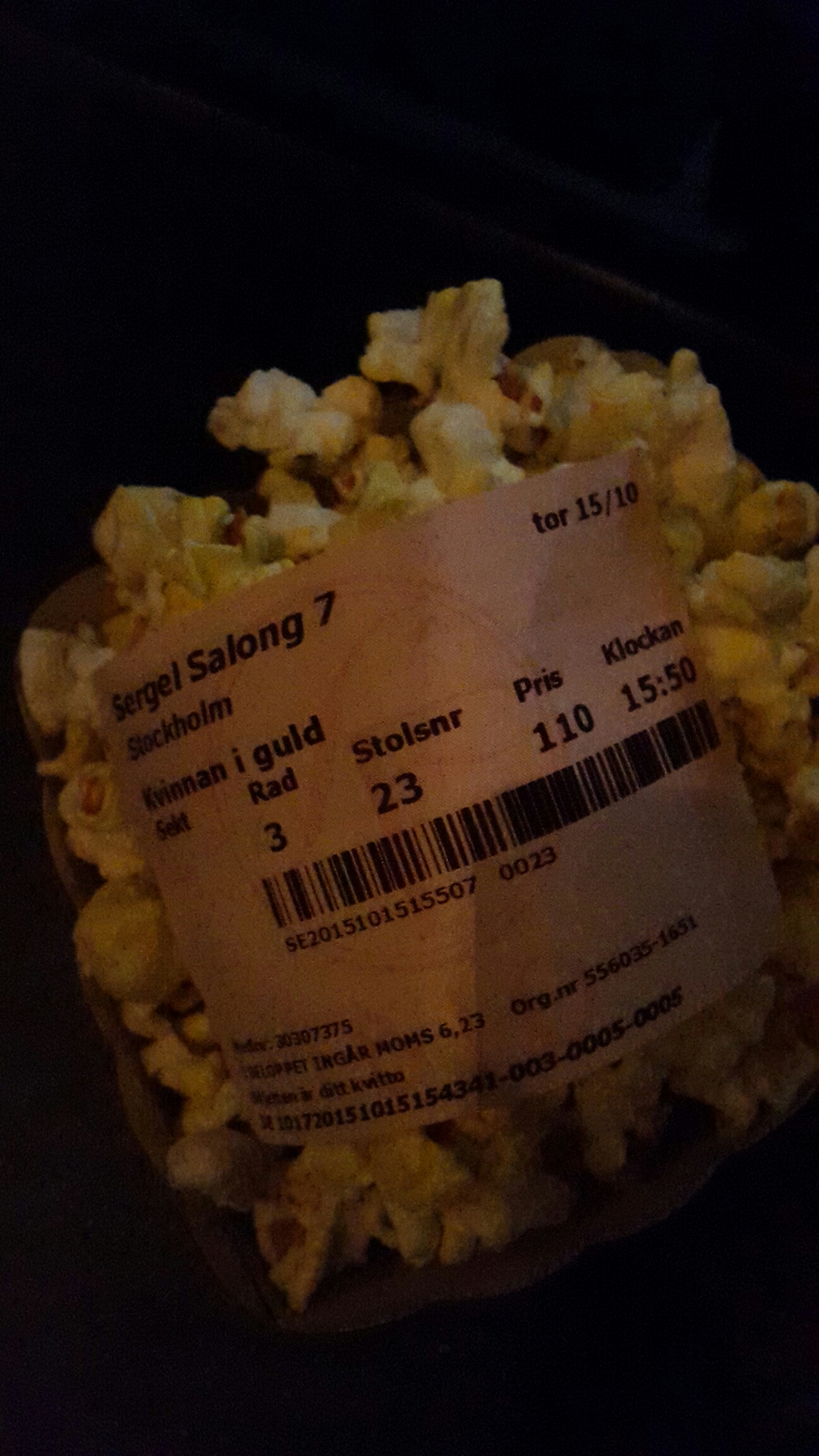 Köpte en liten popcorn och light dricka och sjönk ner i mörkret.