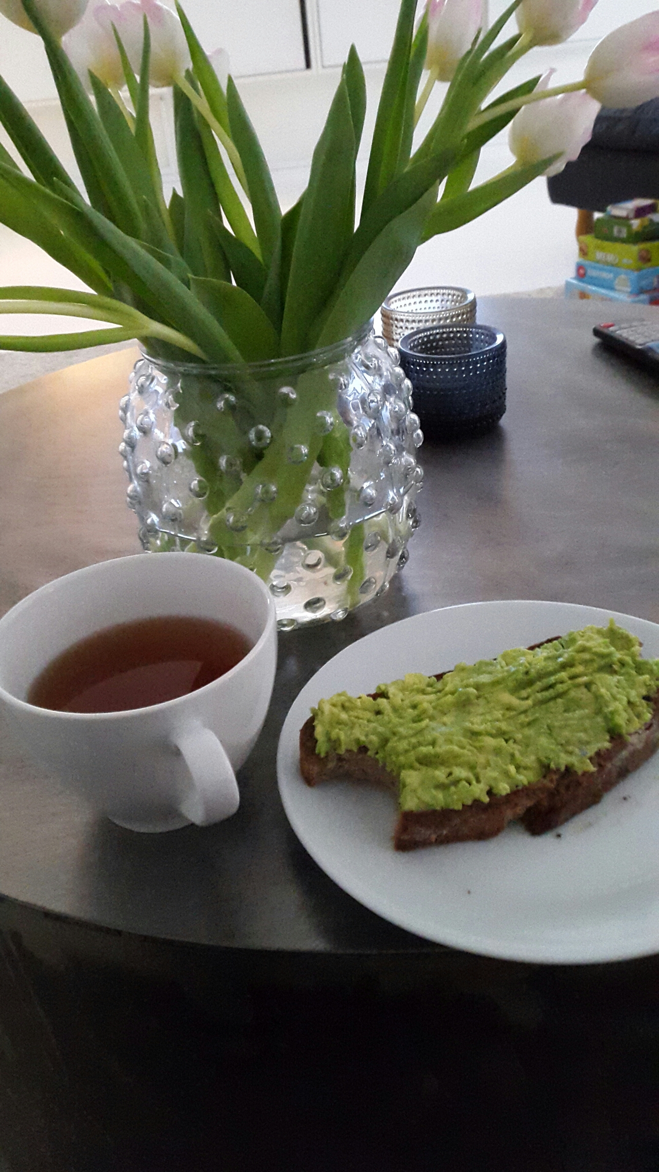 En skiva stekt, gott bröd, med mosad avokado på. Väldigt gott!! Mycket godare än gårdagens frulle….
