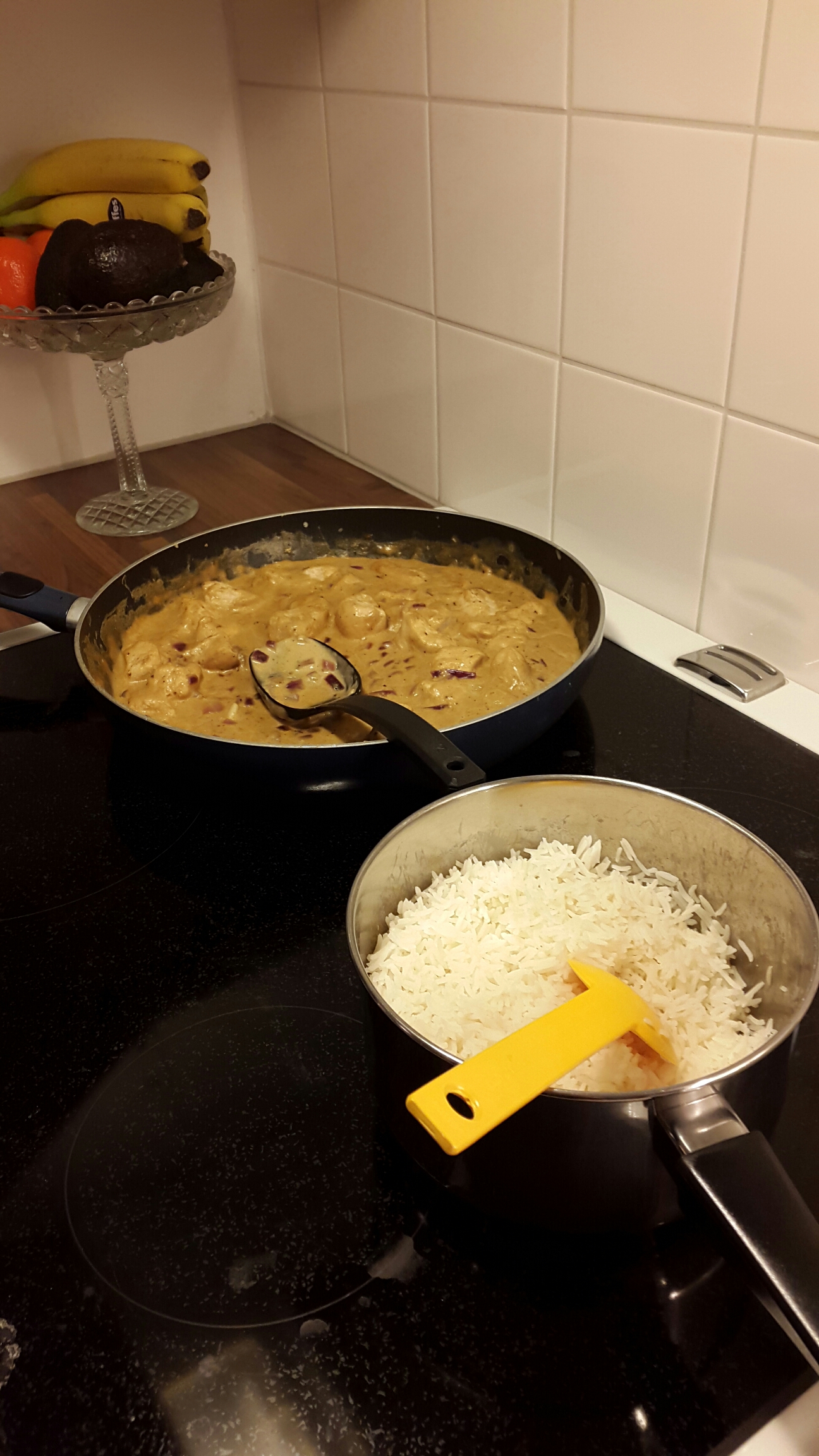 Kyckling med god sås och ris. Det blev riktigt smarrigt!!