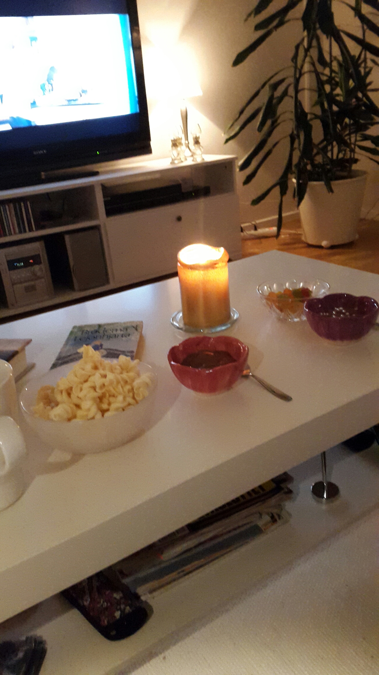 På kvällen åt vi chokladpudding (proteinpudding utan socker!) och lördagsgodis  och tittade på Morrhår och ärtor tillsammans.