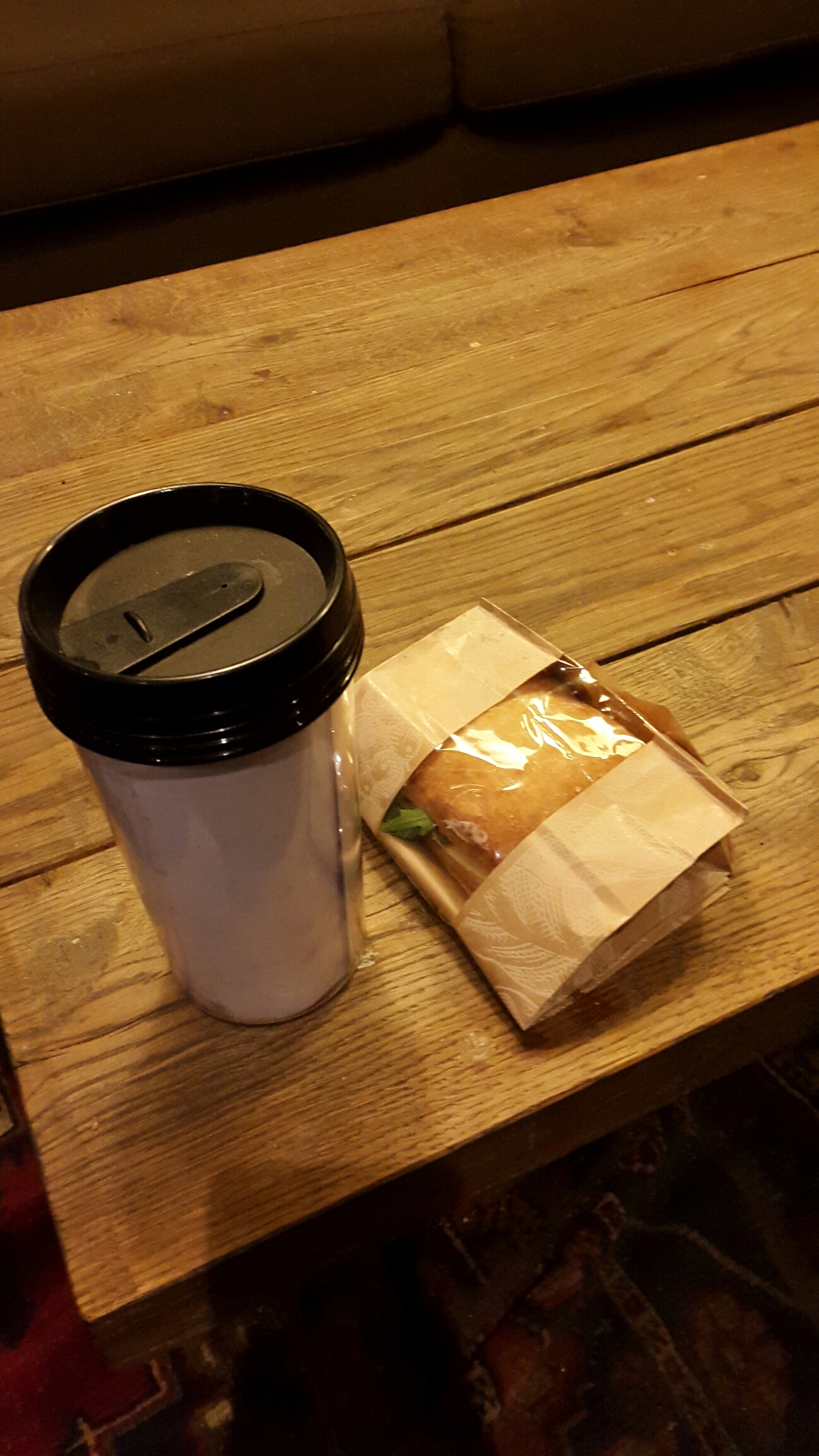 På centralen köpte vi macka till Nettis, och jag hade lattekaffe med mig.