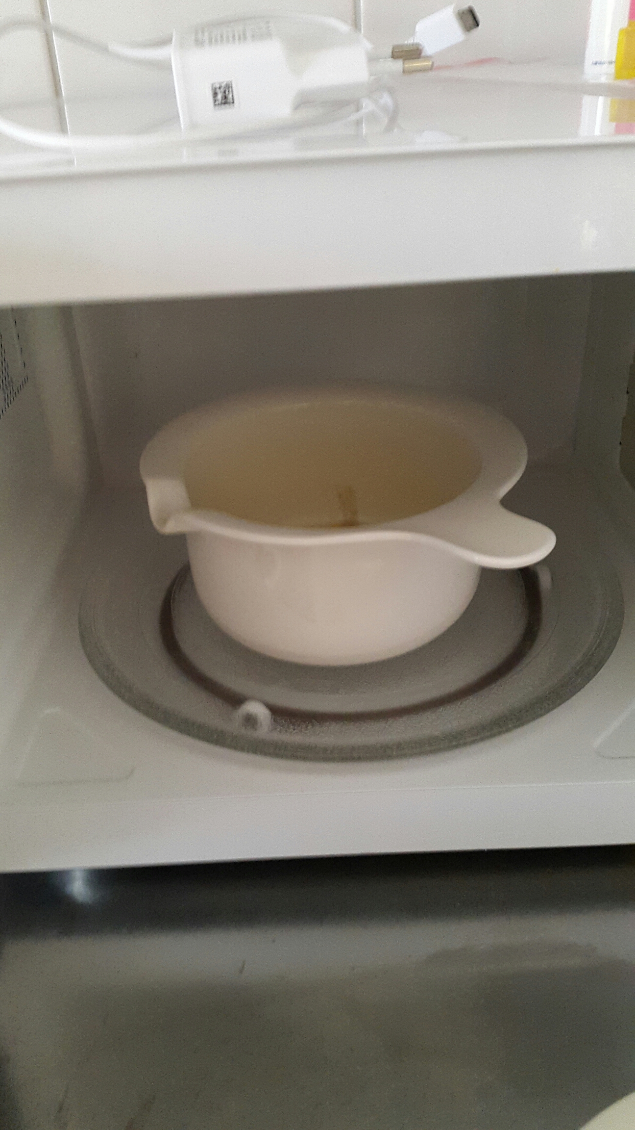 Öppnar micron för att värma upp min lunch. Men vad står där? Det smälta smöret från igår. Eller så smält var det ju inte längre. Undrar hur muffinsen smakar? Är de goda, så har jag i alla fall lärt mig att man skippa fettet helt!