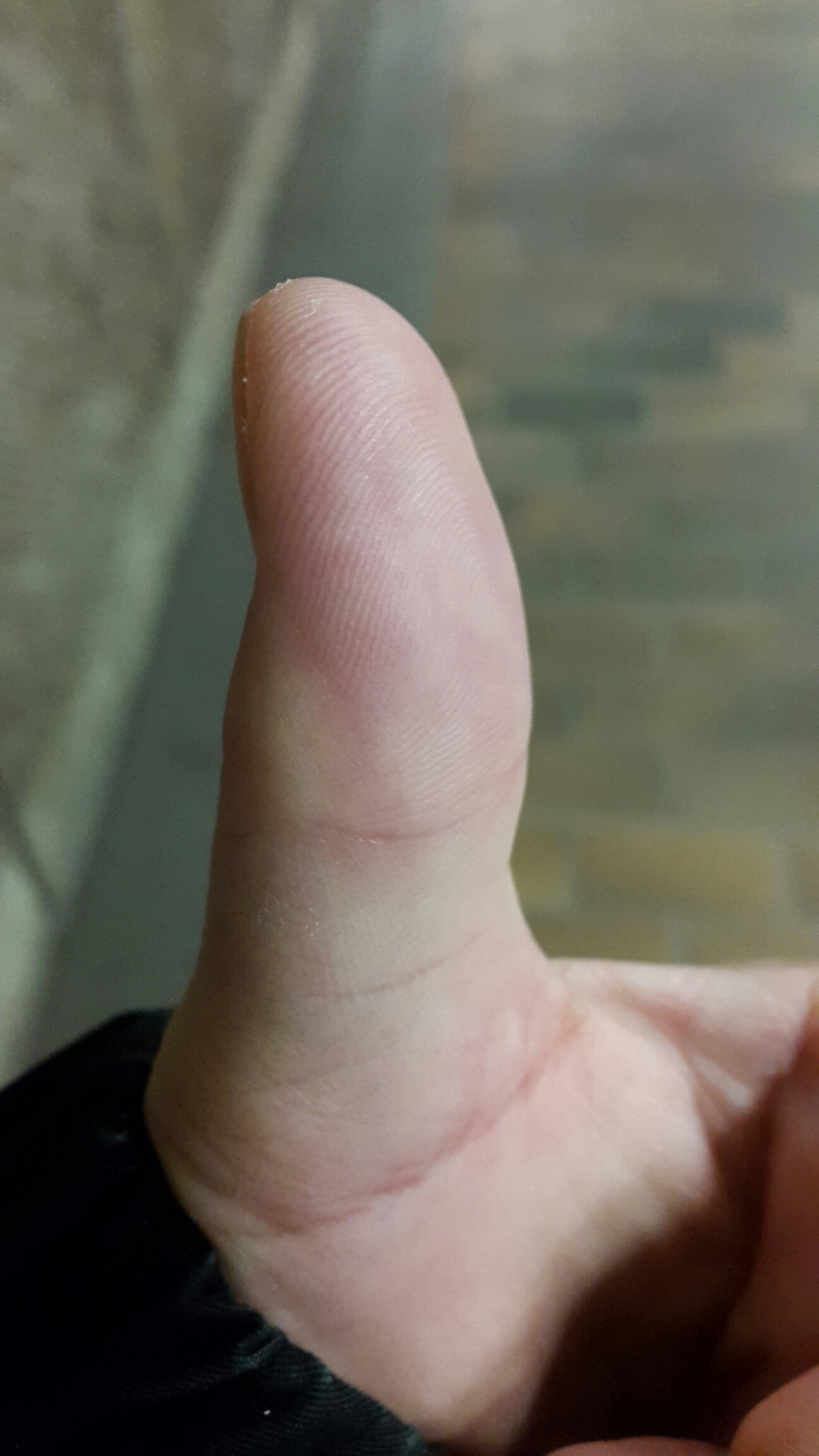 Ändå försöker jag att inte använda den tummen när jag skriver på mobilen lika mycket nu. Men det går av bara farten!
