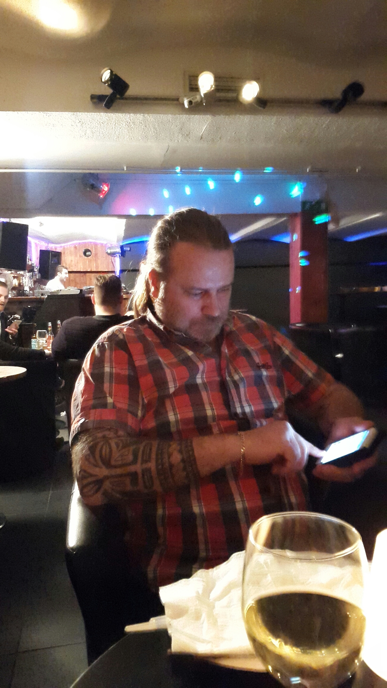 Micke kollar lite i mobilen. Vi satt länge och babblade om livets viktigheter! Han är bra, Micke!