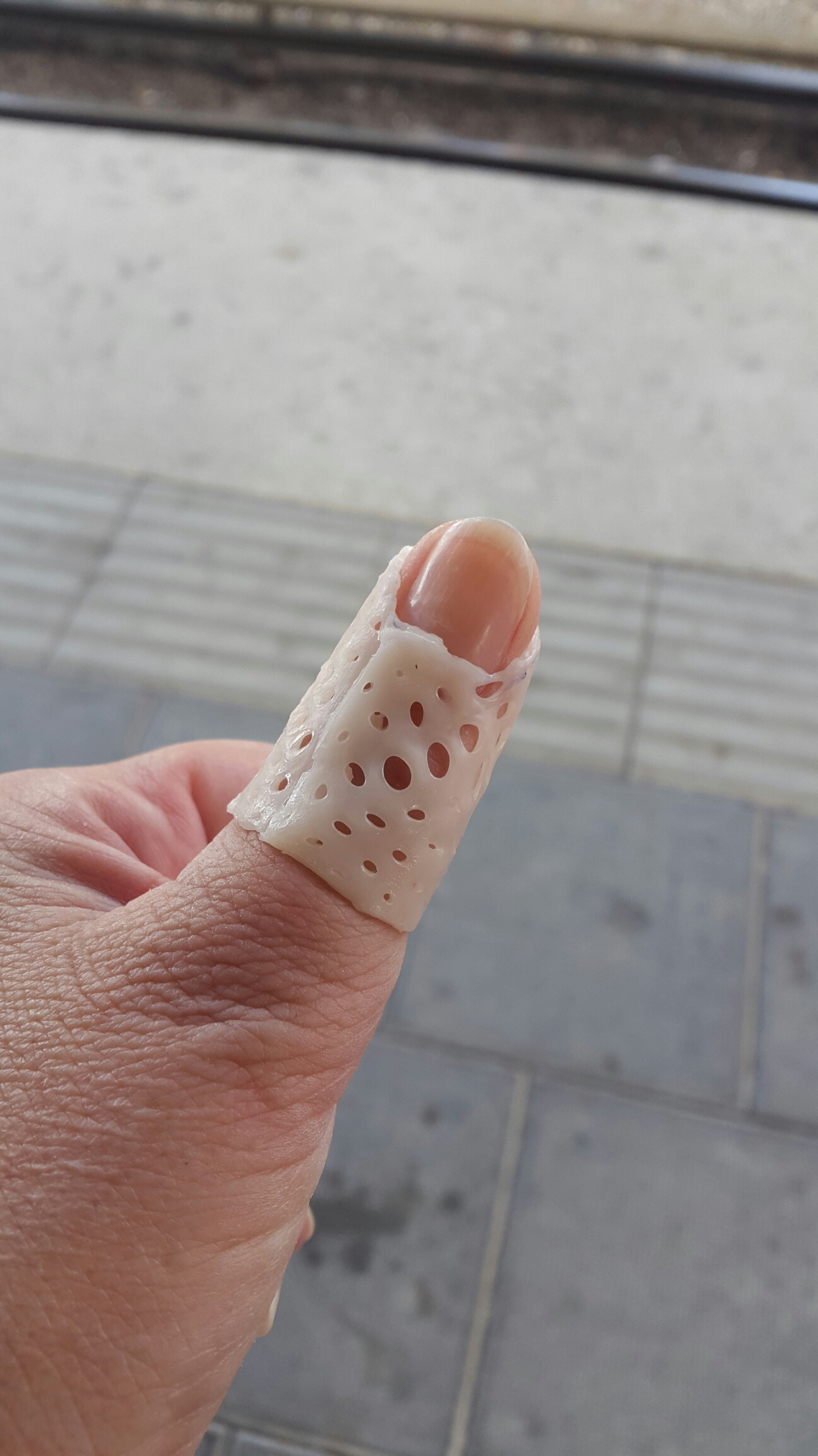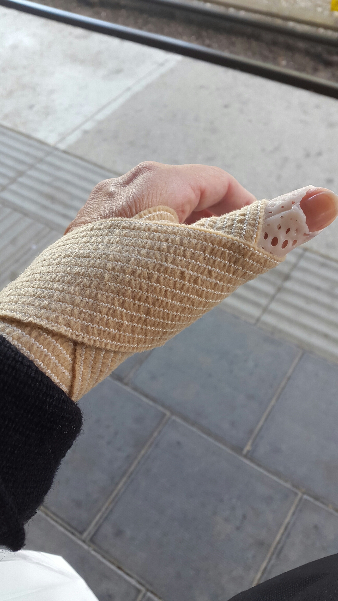 Nu har jag varit hos arbetsterapeuten och fått skena och linda.