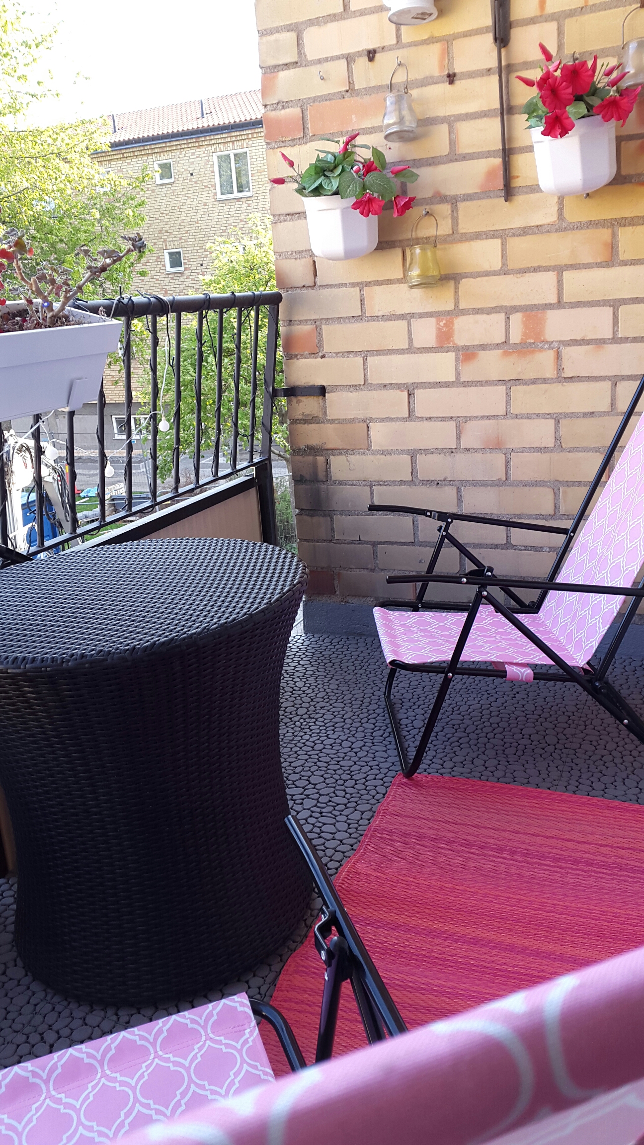 Så 2 rosa brassestolar pryder nu sin plats! Och det var ju varmt så trots att solen inte ligger på mot min balkong på kvällen så kunde jag sitta ute och läsa och dricka lattekaffe. Så mysigt!!