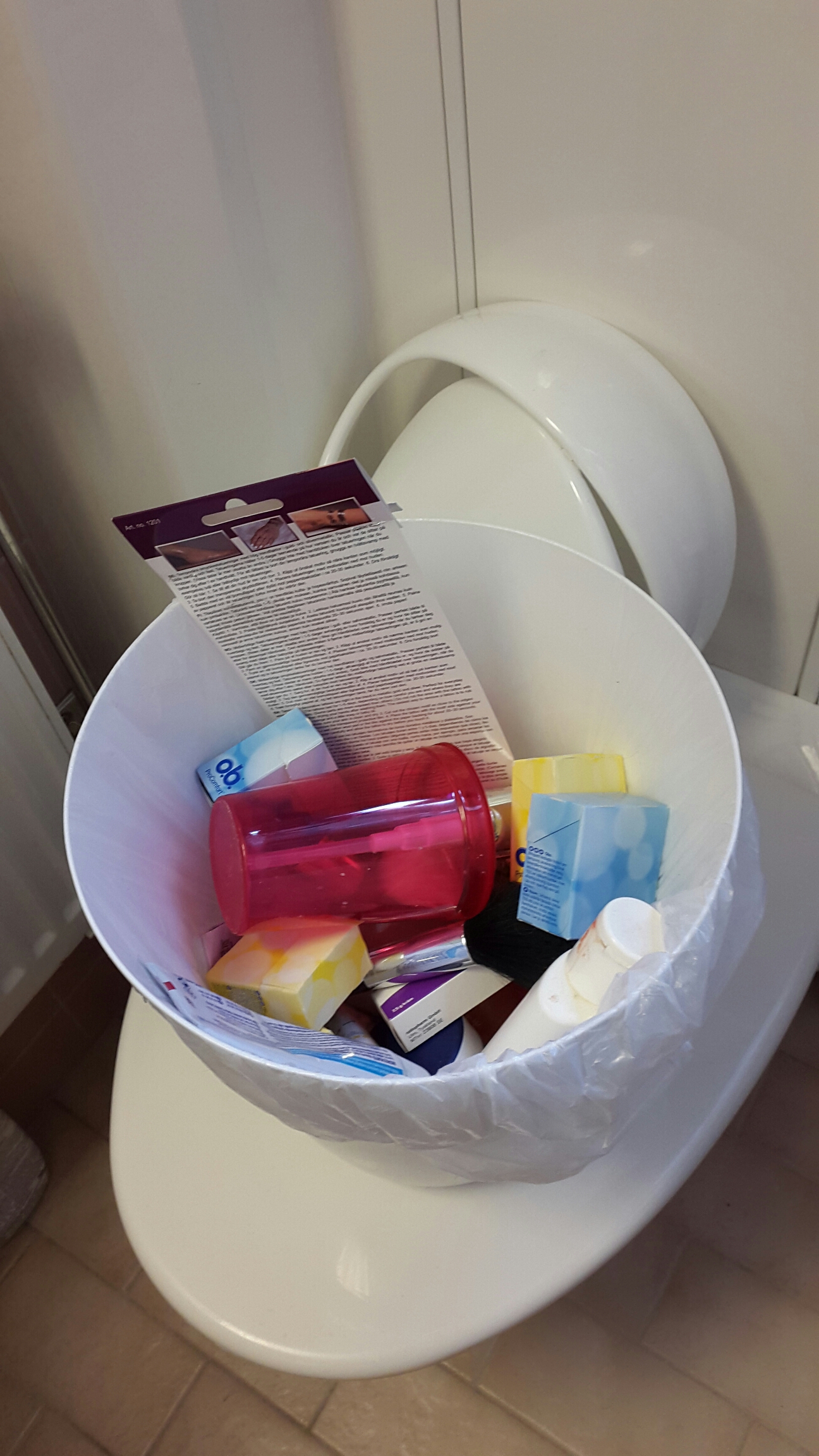 Sen gick jag ut i badrummet och rensade ut i badrumsskåpet och hyllan i duschen. Om den halvtomma flaskan med duschcreme stått i skåpet hur länge som helst så lär den inte användas nu heller. Så nu slängde jag alla såna flarror! Och lite annat krafs!