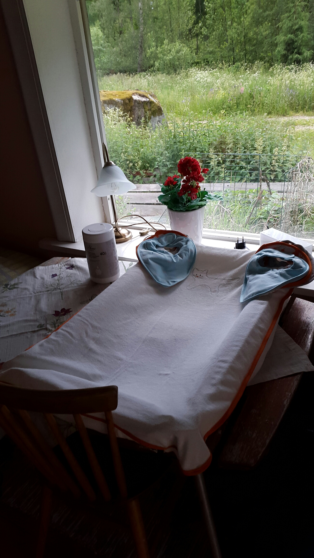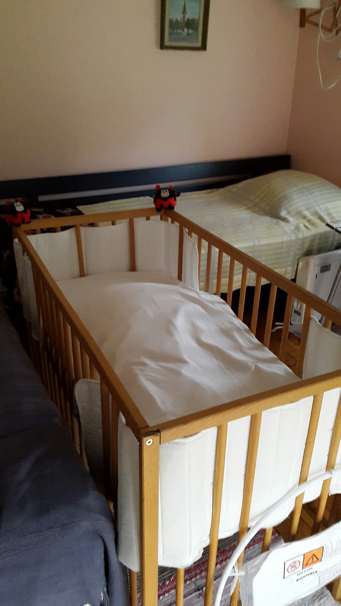 M och jag åkte redan i onsdagskväll. Vi stannade och knatade in på Ikea i Västerås och köpte skötbord och madrass till spjälsäng. Och sen gärnet ut till landet och monterade ihop en spjälsäng som M köpt på blocket. Att vi monterade den innebär att M sa var ska den här sitta, och jag sa jag vet inte! Men vi fick till det!