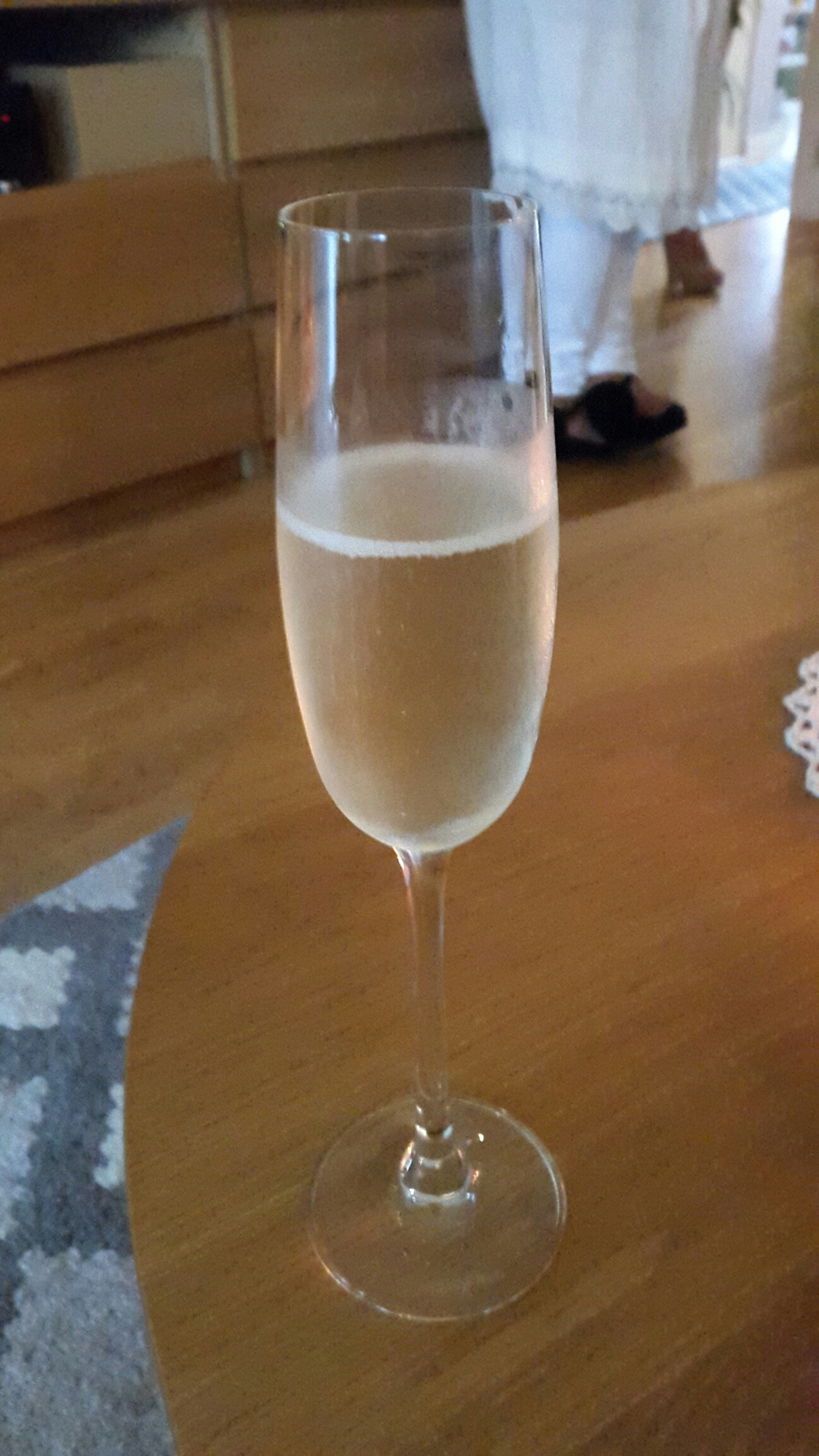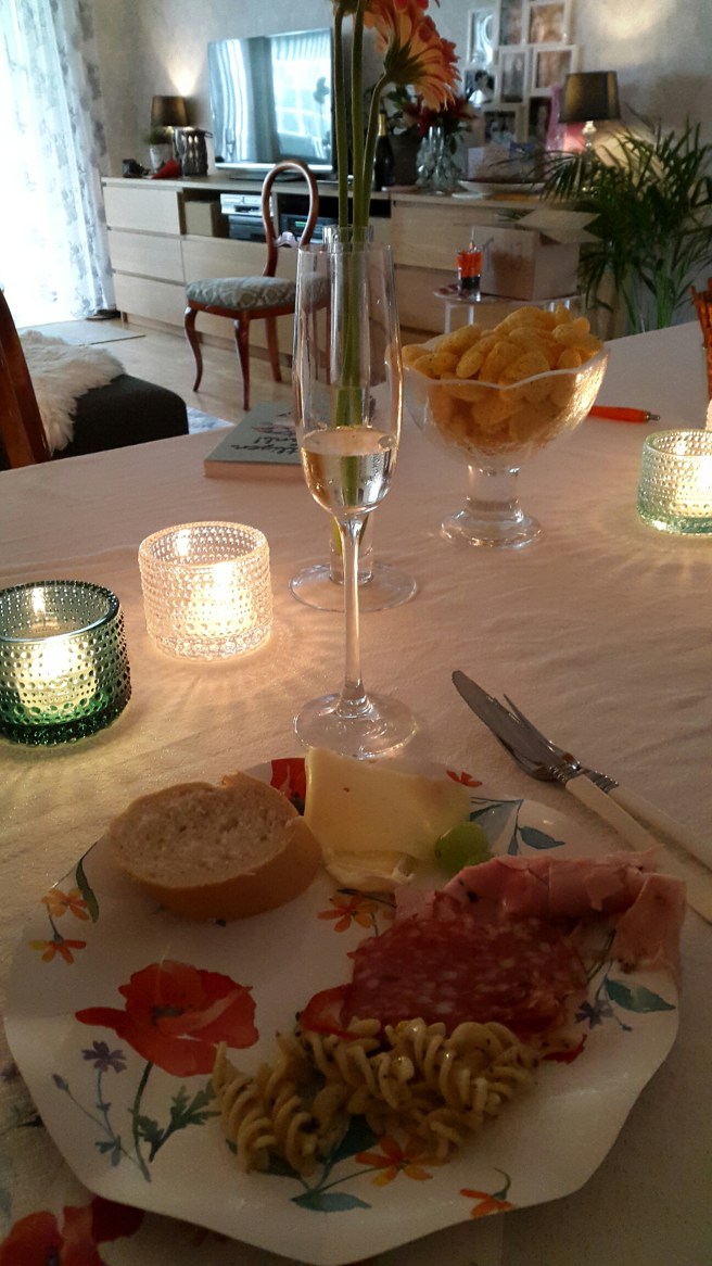 Vi fick bubbel när vi kom, och glaset fylldes generöst på ett antal gånger…. Och sedan bjöds det på mat! Hur mycket som helst! Kallskuret och sallader, ostar och bröd. Så gott!! Och sedan kaffe och 3 olika tårtor. Jag tog 1 liten bit av en supergod chokladtårta! !!
