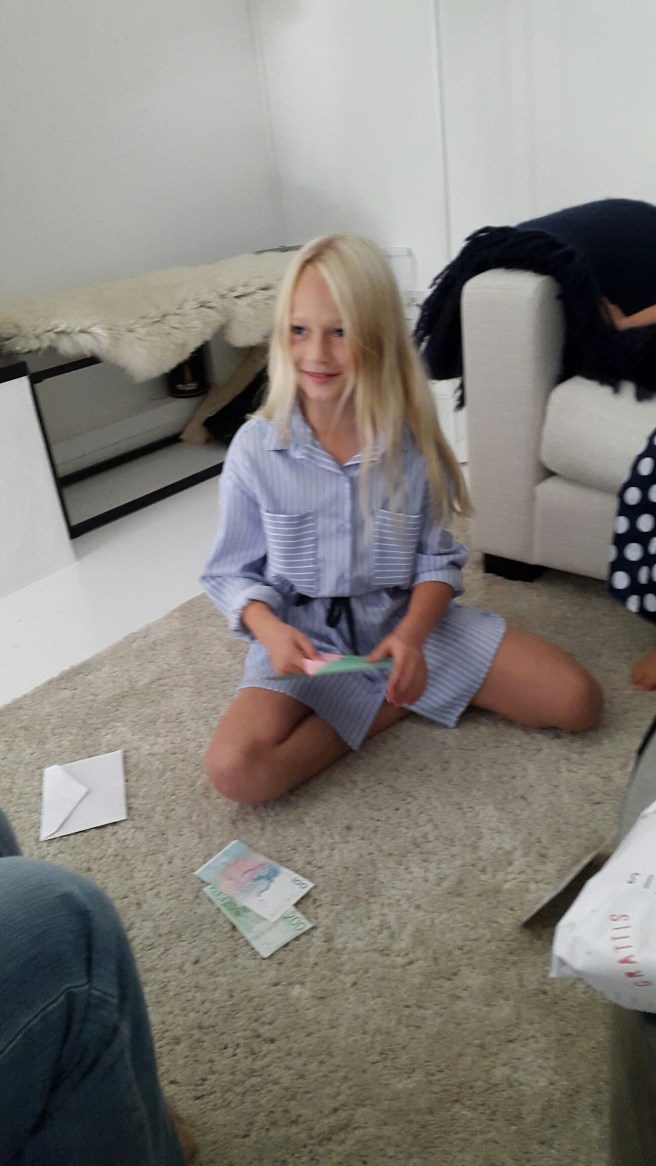 En massa paket, men det hon blev gladast för var det stora paketet hon fick av mamma och pappa: en airboard. Hon blev så glad så hon inte kunde vara still!! Härligt!