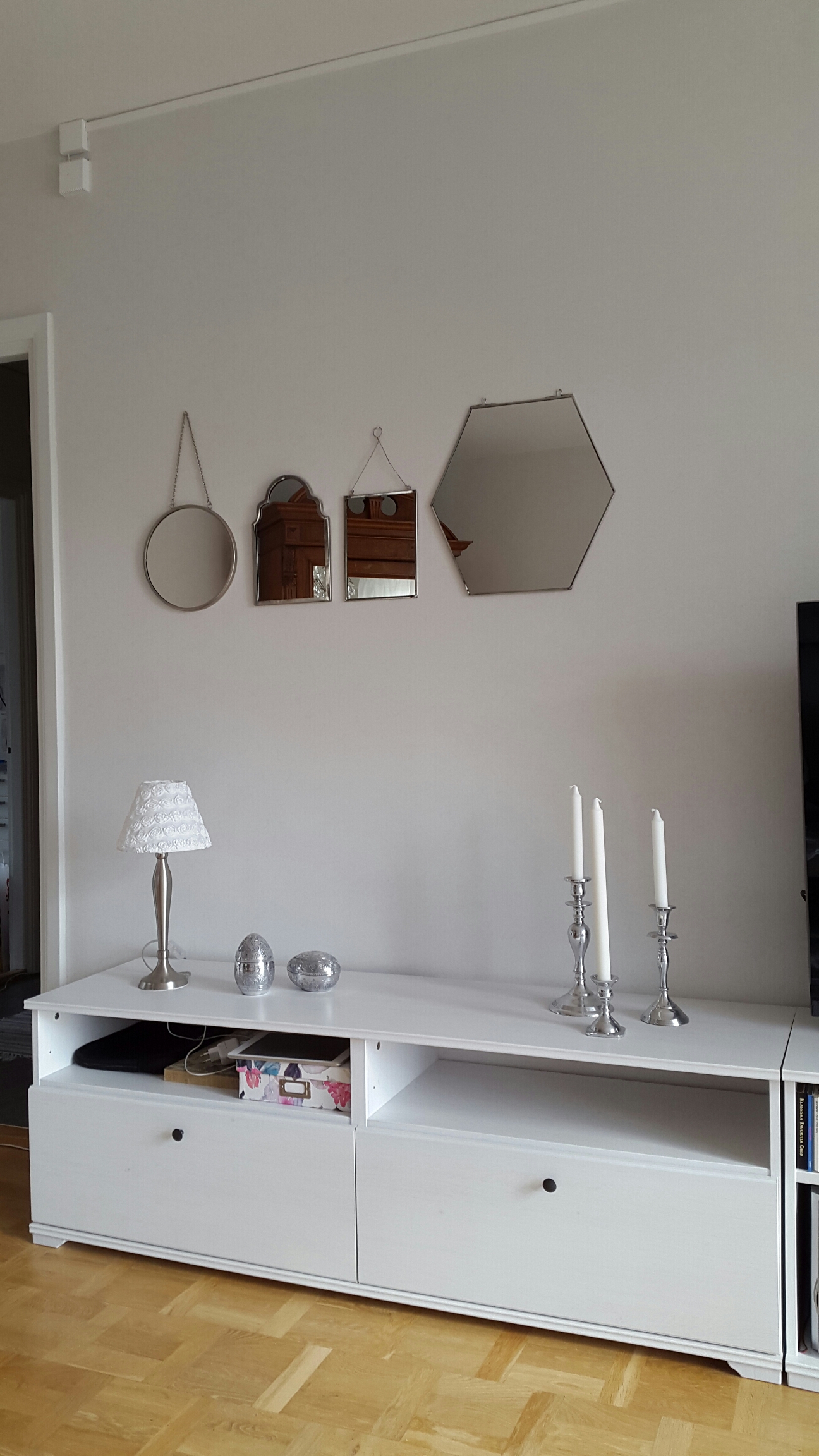 Låg i soffan och läste och fick syn på speglarna. Den senaste satt verkligen fel! Gick upp och bytte plats på den.