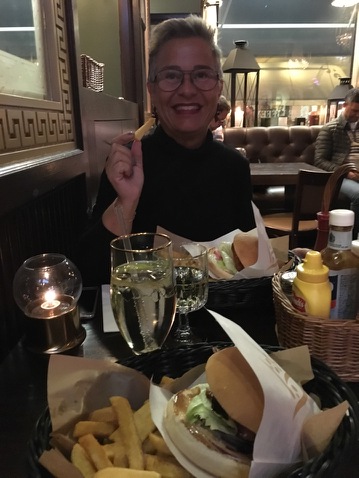 Jenny tog en cider och jag ett glas vitt. Jösses, andra glaset vin samma vecka!! Och så åt vi, jag en haloumi burgare och Jenny en hamburgare.