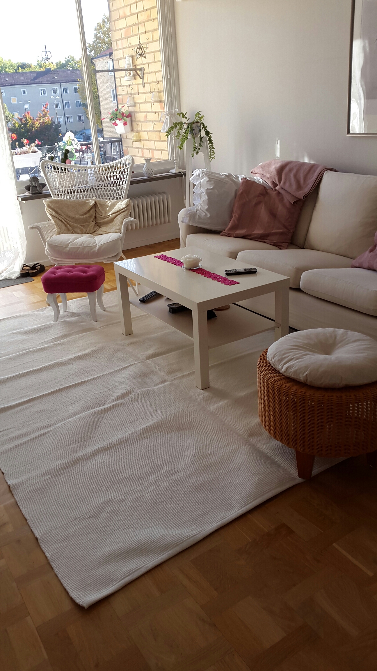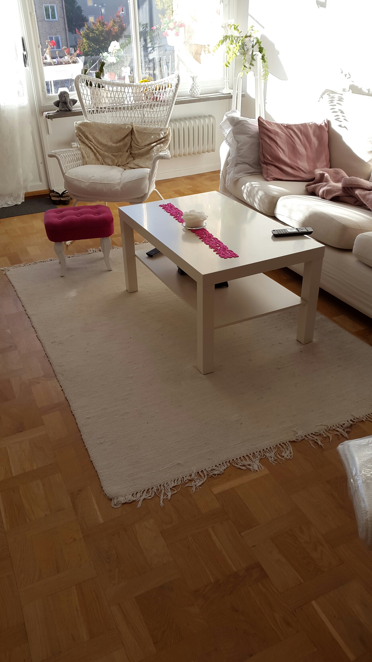 Nu har jag dammsugit av vardagsrummet och torkat golvet. Och lagt på nya mattan. Så här såg det ut med gamla mattan.