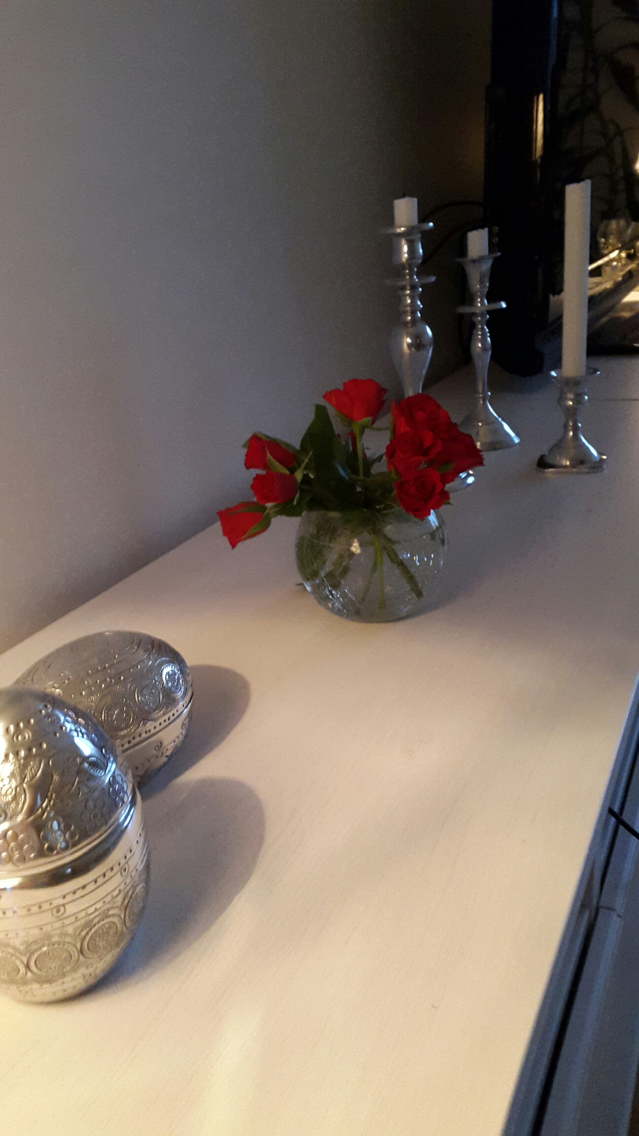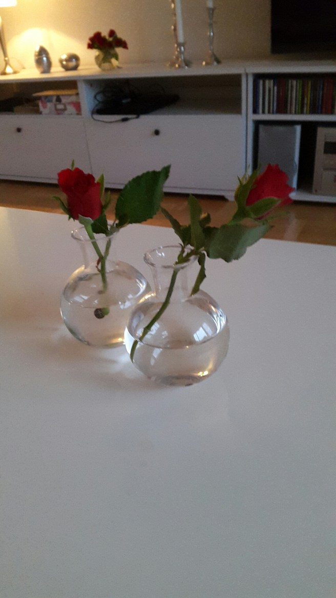 Jag hittade små rosor för 20 kronor för en bukett med 7 st i affären. Så jag köpte 2 knippen, och satte i en liten rund vas/ljuslykta.