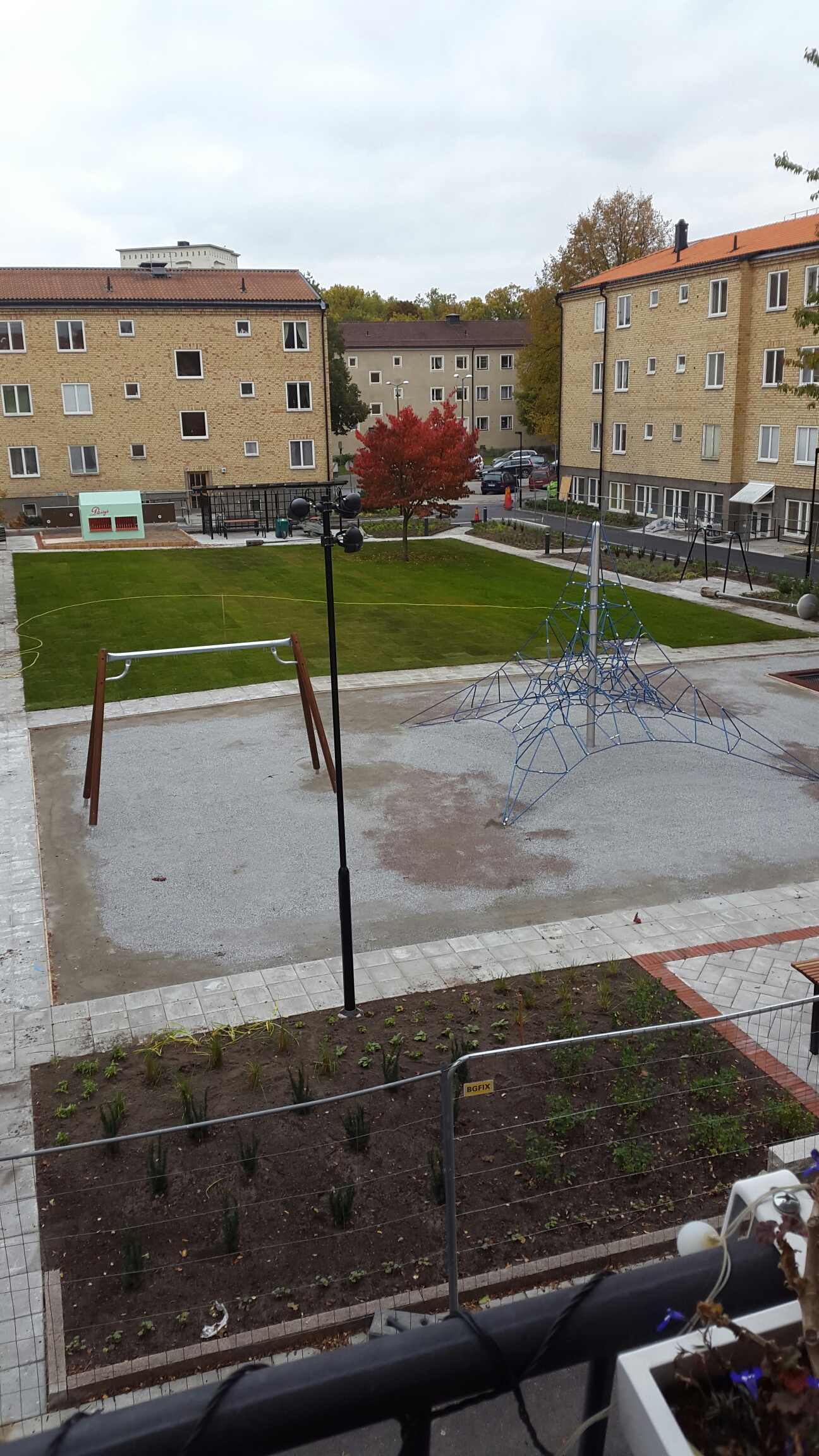 En massa växter planterade och idag kom en gräsmatta! Några lyktstolpar som inte står på plats än och så ska det väl vara gungor,antar jag, bredvid kläternätet. Sen tycker i alla fall jag att det ser ut vara klart!