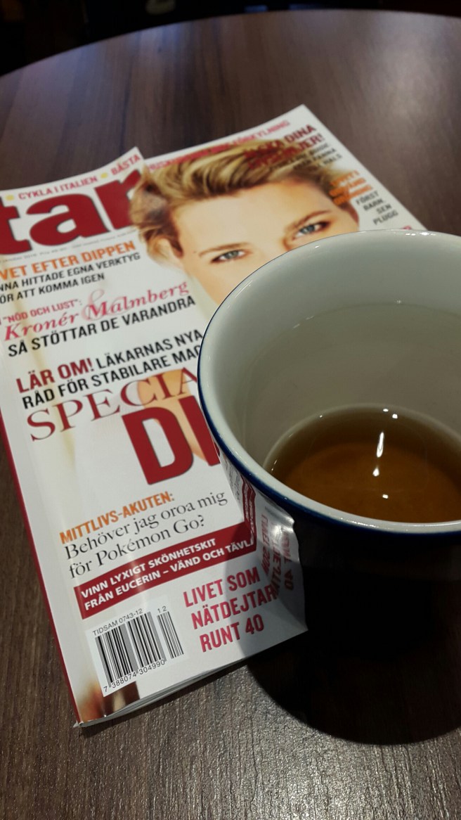 Älskar att sitta på fik och kolla lite på folk och bläddra i en tidning g. eller läsa bok, men idag hade jag glömt boken hemma. Brukar alltid ha den med, men inte idag.Så då köpte jag en Tara.