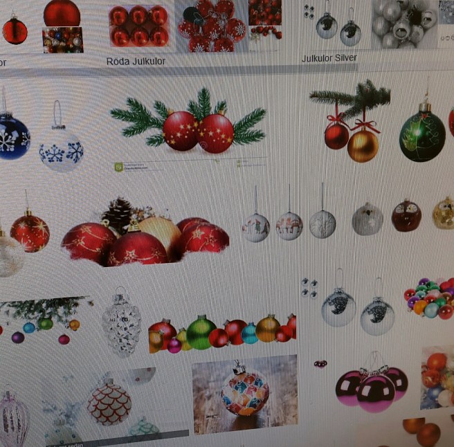 Jag har ju inte julgran eller en massa pynt hemma. Jag är ju själv, och över hela julen ska jag vara hos Systeryster. Men det finns så himla många fina julkulor numera! När jag var in på Åhléns sist så stod jag länge och suktade vid julkulor.