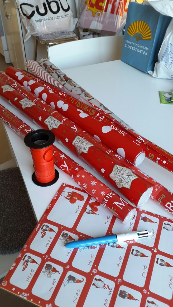 Jag tog fram julpapper för att börja slå in klapparna som ska med till Chicago.