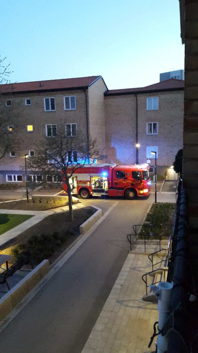 Igår när jag kom hem efter jobbet så satte jag mig med mitt kvällsmål och tittade på Follow the money på TV. Rätt var det är så ser jag att det kommer svart rök från baksidan av huset som står i vinkel med mitt. Och så börjat det puffa ut svart rök även på framsidan, från balkongen och sovrumsfönstret från en av lägenheterna. Så jag skyndar mig att ringa SOS! De hade precis fått larm om det, och jag misstänker att grannen ovanför ringt,för hon var ut på balkongen strax innan.