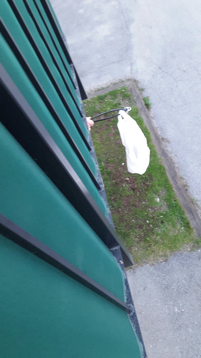 När Gudsonen skulle åka hem så hade han en grej i bilen som han glömt ta med upp så vi skulle försöka få tag i från balkongen.