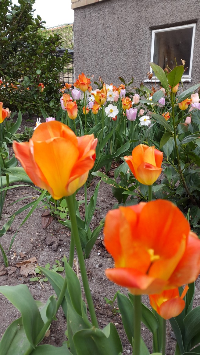På gården blommar rabatterna för fullt. Så skönt att de är klara på vår gård i år! Nu är det gården bredvid de jobbar med, men det låter inte till mig.