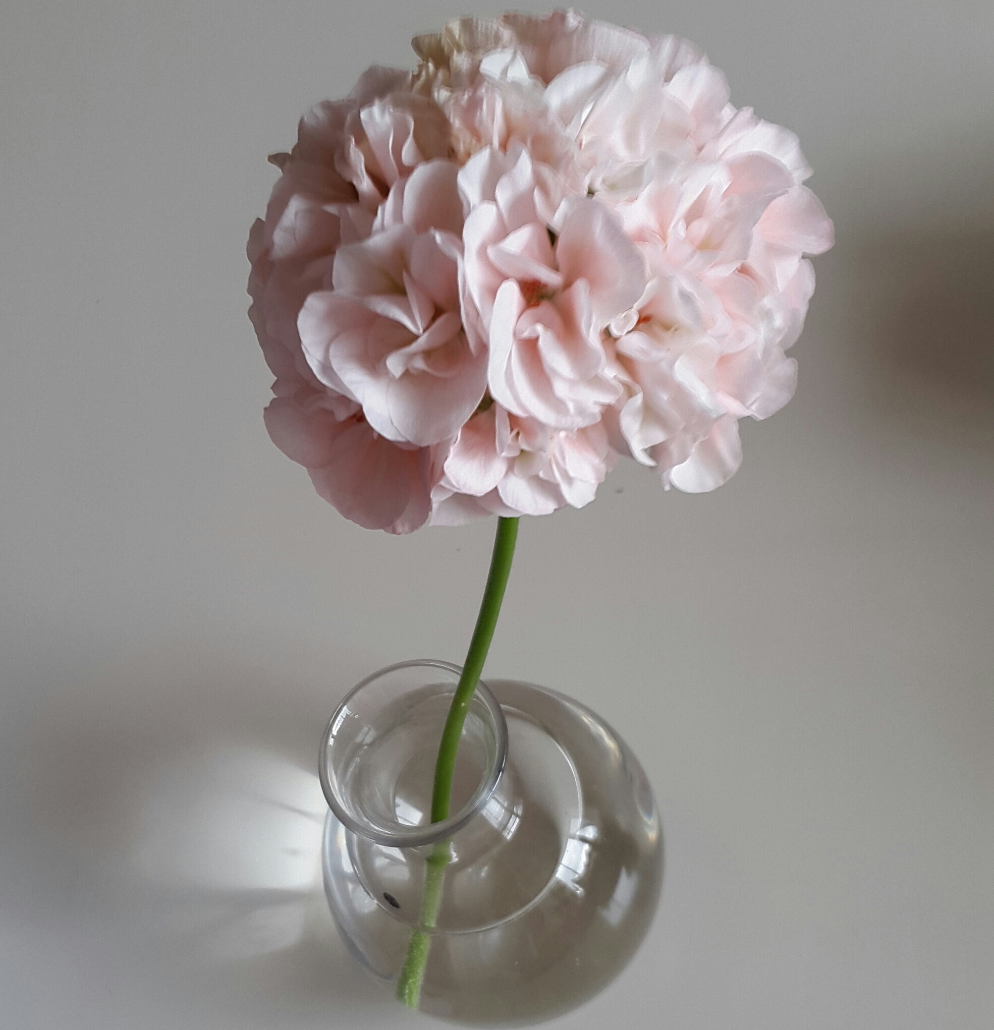 M har lärt mig att man ska knipsa bort blommorna på pelargoner när de blommat ut helt, så kommer det flera nya. Men det känns synd att bara slänga dem. Så nu står den här och är fin på rumsbordet!