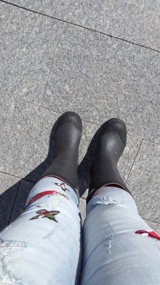 Det duggade imorse och var helt mörkt på himlen, så jag tyckte det var en bra idé att kliva i sjumilastövlarna. Och självklart skiner solen nu!