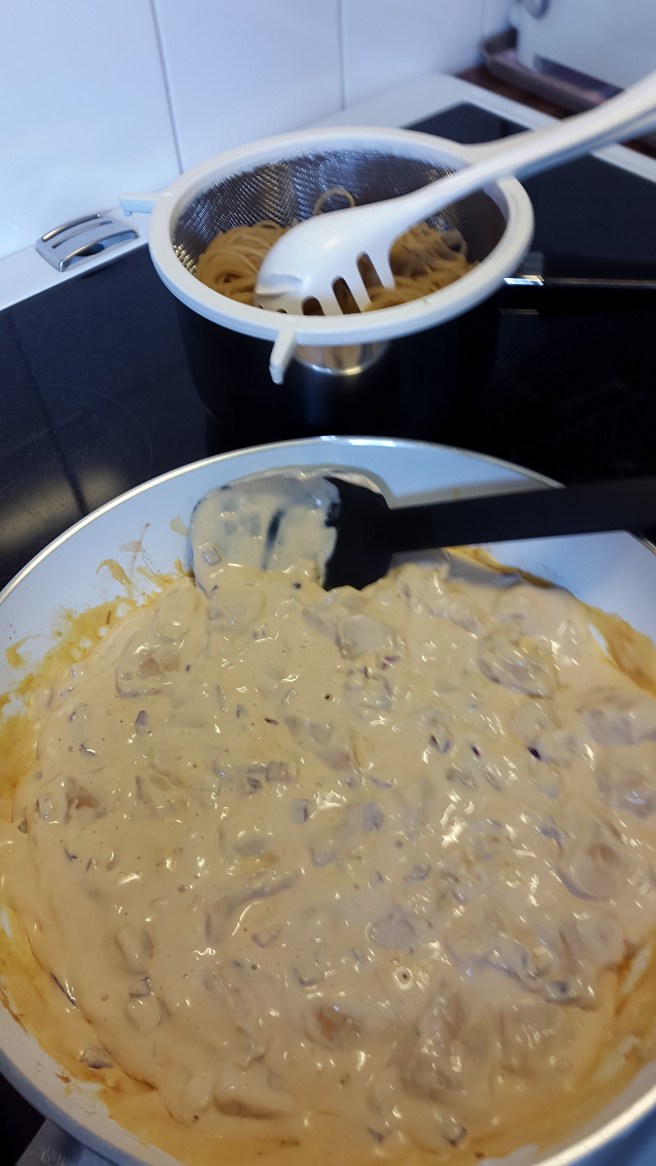 Stekte kycklingfile i bitar, hade i hackad lök och lite vitlök och så fick det koka ihop lite. Mums!